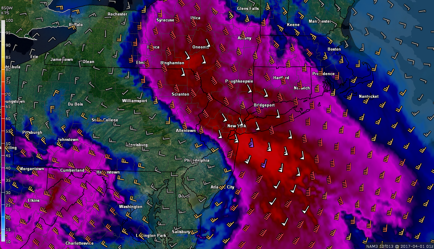 Today’s low pressure is in the perfect position to provide sustained heavy precipitation as the upper level configuration is reminiscent of something that we would look for in the winter to produce a very significant snowstorm for the area. However, the lack of a sustained/fresh cold air source will ensure that the overwhelming majority of this storms precipitation falls as plain rain. This upper level pattern configuration with a closed upper level low being forced east underneath an area of high pressure strongly suggests that a secondary low pressure system will form off of the coast, and this is exactly what will happen late this evening. As this low pressure begins to strengthen late this evening, the aforementioned band of very strong winds just above the surface, or low-level jet, will help to funnel in very moist air from the south. This will increase rain rates for NJ/NY/CT/ and also bring some gusty winds, especially for the LI and CT coasts.