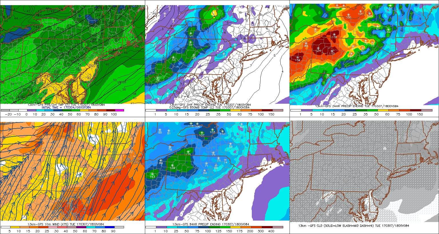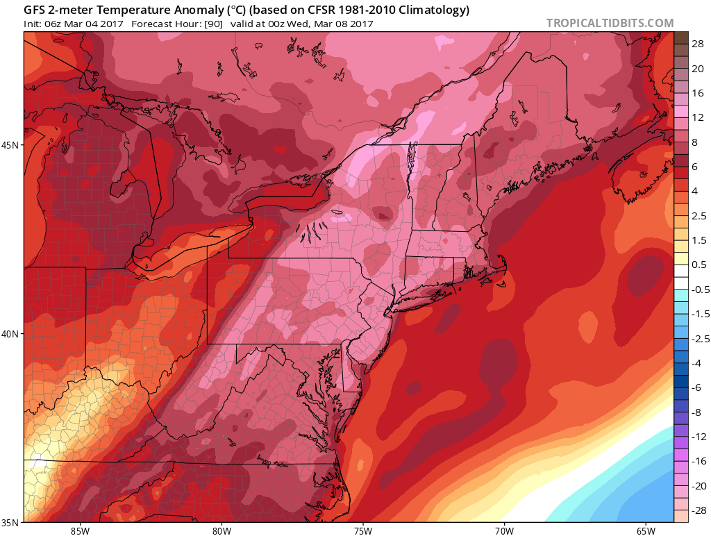 GFS showing temperatures warming into the 50s and 60s over the region, ahead of cold front with showers approaching from the west on Tuesday