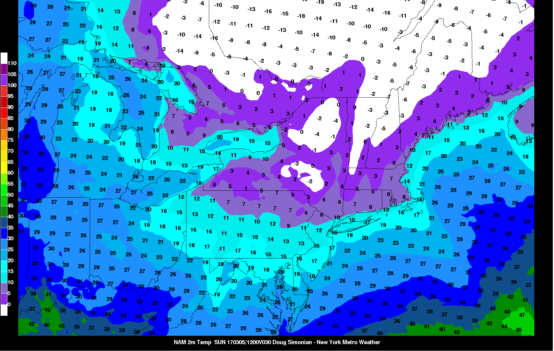 NAM model showing temperatures in the single digits and teens over the region early Sunday morning