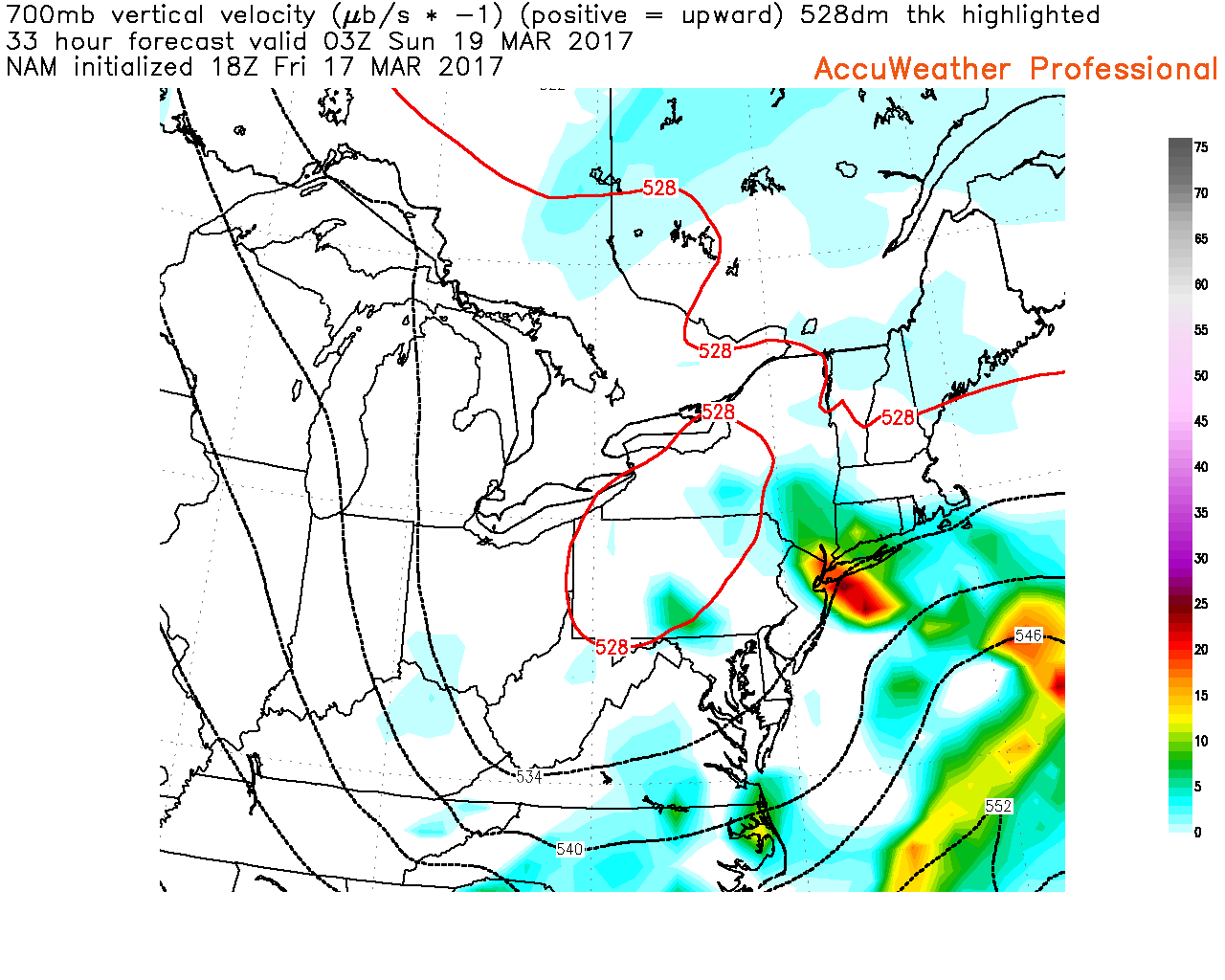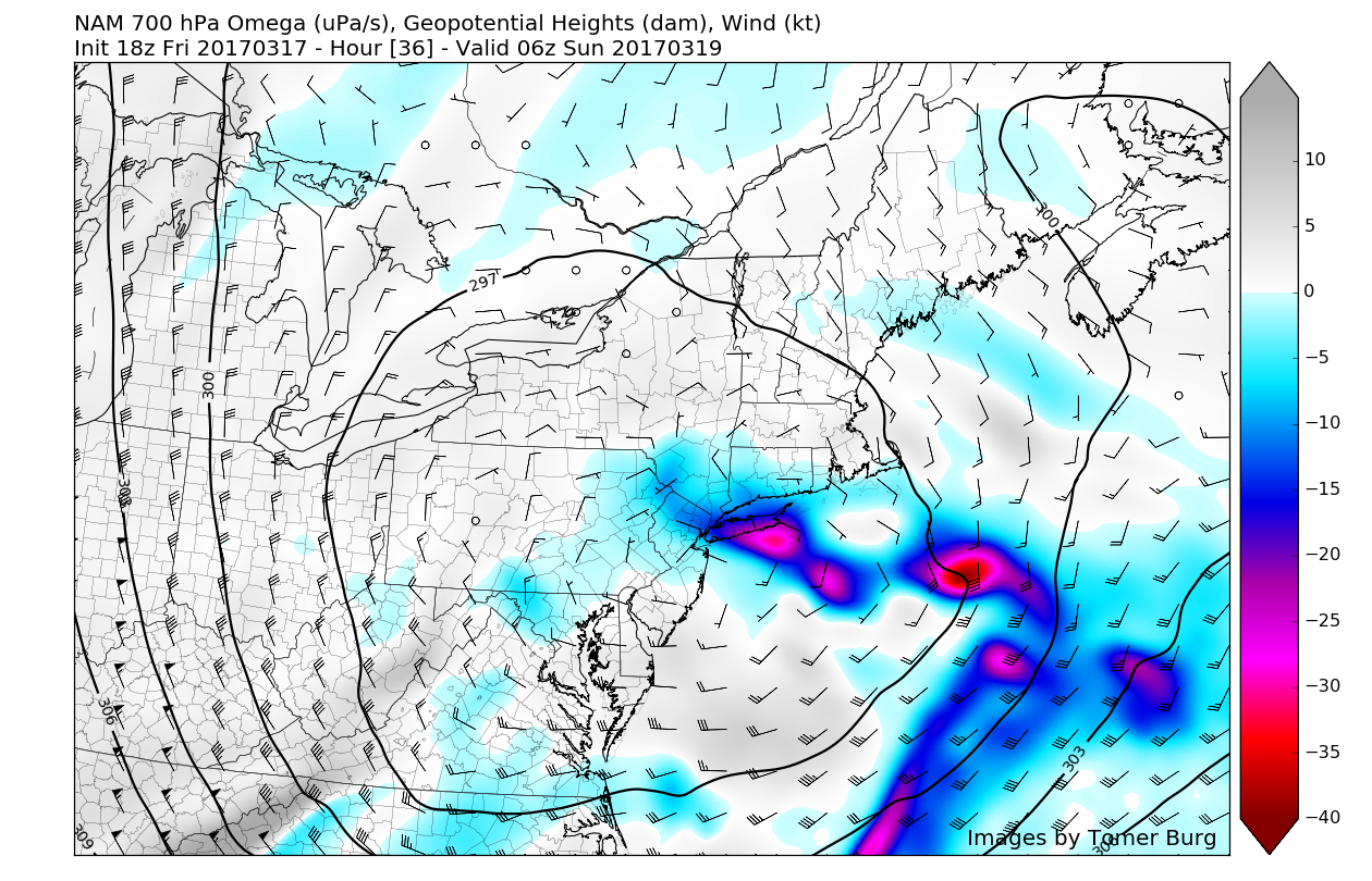 12km NAM showing very favorable lift (in yellow, orange, and red) for heavier snow on Saturday evening