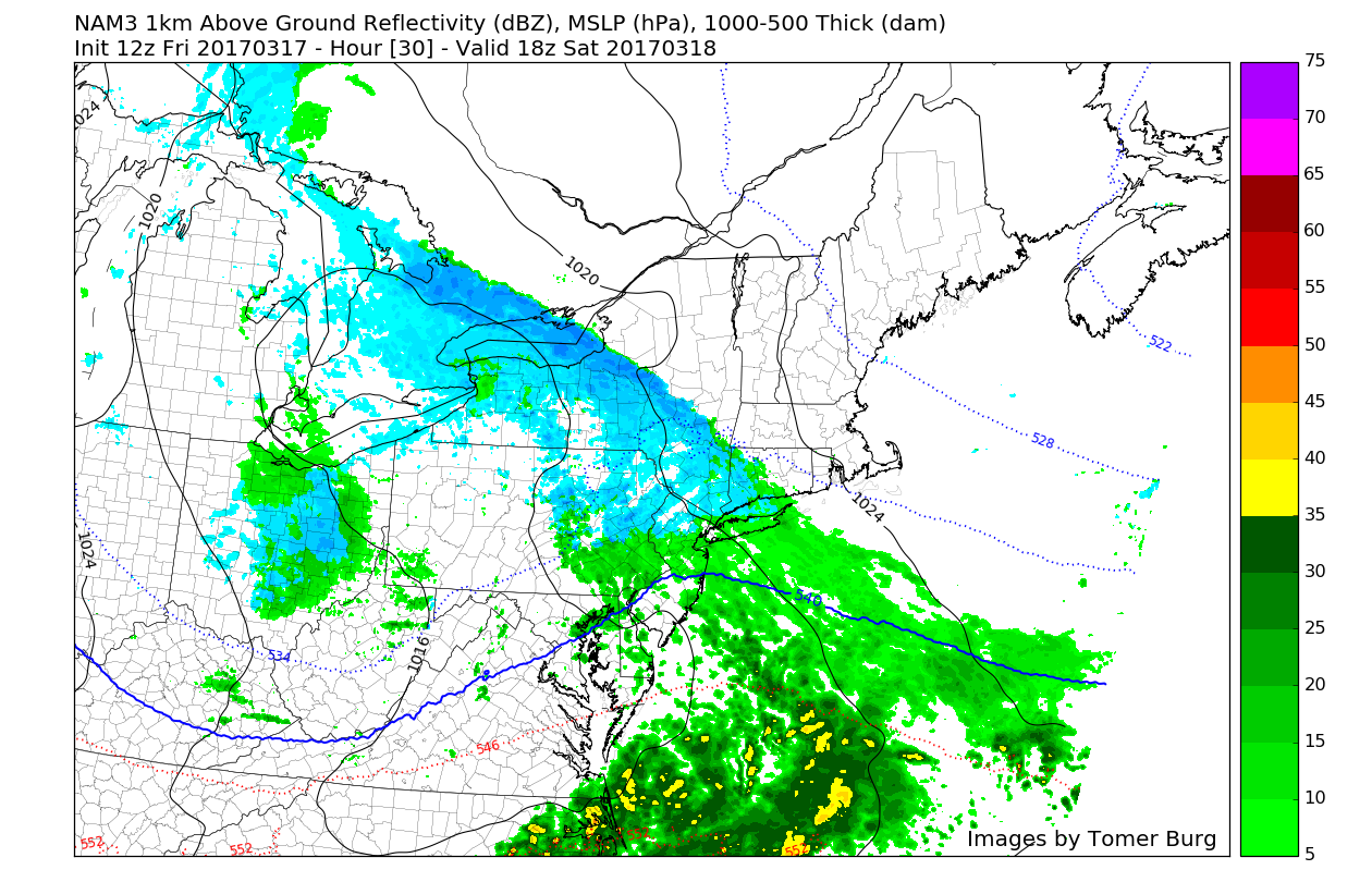 As we move into tomorrow, there is potential for some snow starting very early Saturday morning as the low pressure in Canada begins to move into the Great Lakes region, which will act to push the stationary front towards the area. Clouds should increase in earnest tomorrow morning with an early threat of some light rain or snow, but mainly a mix of rain and snow is expected for New York City, Central New New Jersey, Long Island, as well as locations to the south. Since we are getting further into March, ground temperatures will be an issue-as is the case with tomorrow’s initial batch of precipitation. Since the rain/snow mix will be quite light in nature along with warmer surface temperatures, very little to no accumulations are expected for these aforementioned regions. Since thermal profiles will be more supportive of an all-snow scenario to the North and West, some light accumulations can be expected-especially on grassy surfaces. Even though accumulations should be relatively minor with this first batch of precip, they may create slick driving conditions even if they are in the form of plain rain, so please use caution.