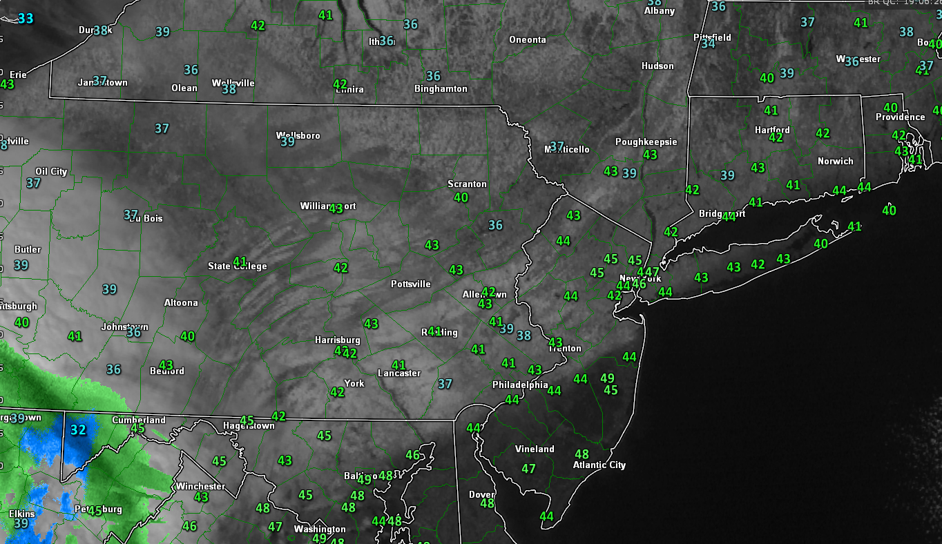 Today has been a beautiful day in contrast with the previous few days across the entire area as temperatures have climbed into the mid-upper 40’s the afternoon underneath mostly sunny skies. While it does feel more comfortable outside, these temperatures are still below-normal for this time of year. Some gusty winds were noted this afternoon as a large area of high pressure situated to our south and a quick-moving low in Canada create a pressure gradient over the Northeast. As we head into the evening, the winds should subside a bit, but as the aforementioned low pressure in Canada begins to move to the south east, some broken high clouds should begin to take over. This is part of a frontal system associated with the low in Canada that could bring the threat of some light rain or snow to western areas of NJ and eastern Pennsylvania.