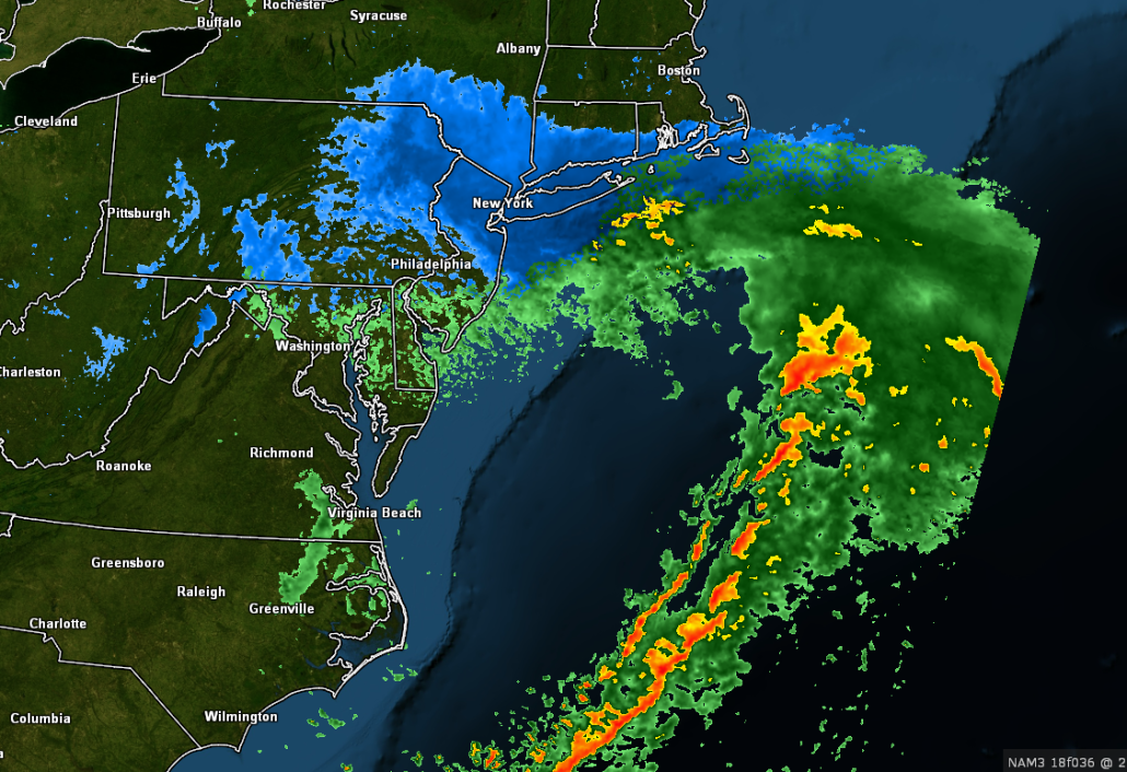 3km NAM simulated radar valid at 9am tomorrow morning showing a very light mix of rain and snow over the area (Credit: Tomas Burg UAlbany)
