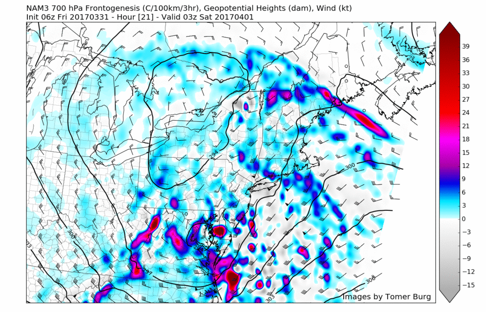 High-resolution NAM model showing strong 700mb frontogenesis moving through parts the region tonight, resulting in more forcing for very heavy rainfall.