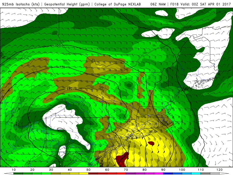 NAM model with strengthening low-level jet with 925mb winds increasing to 50kts+ over coastal sections