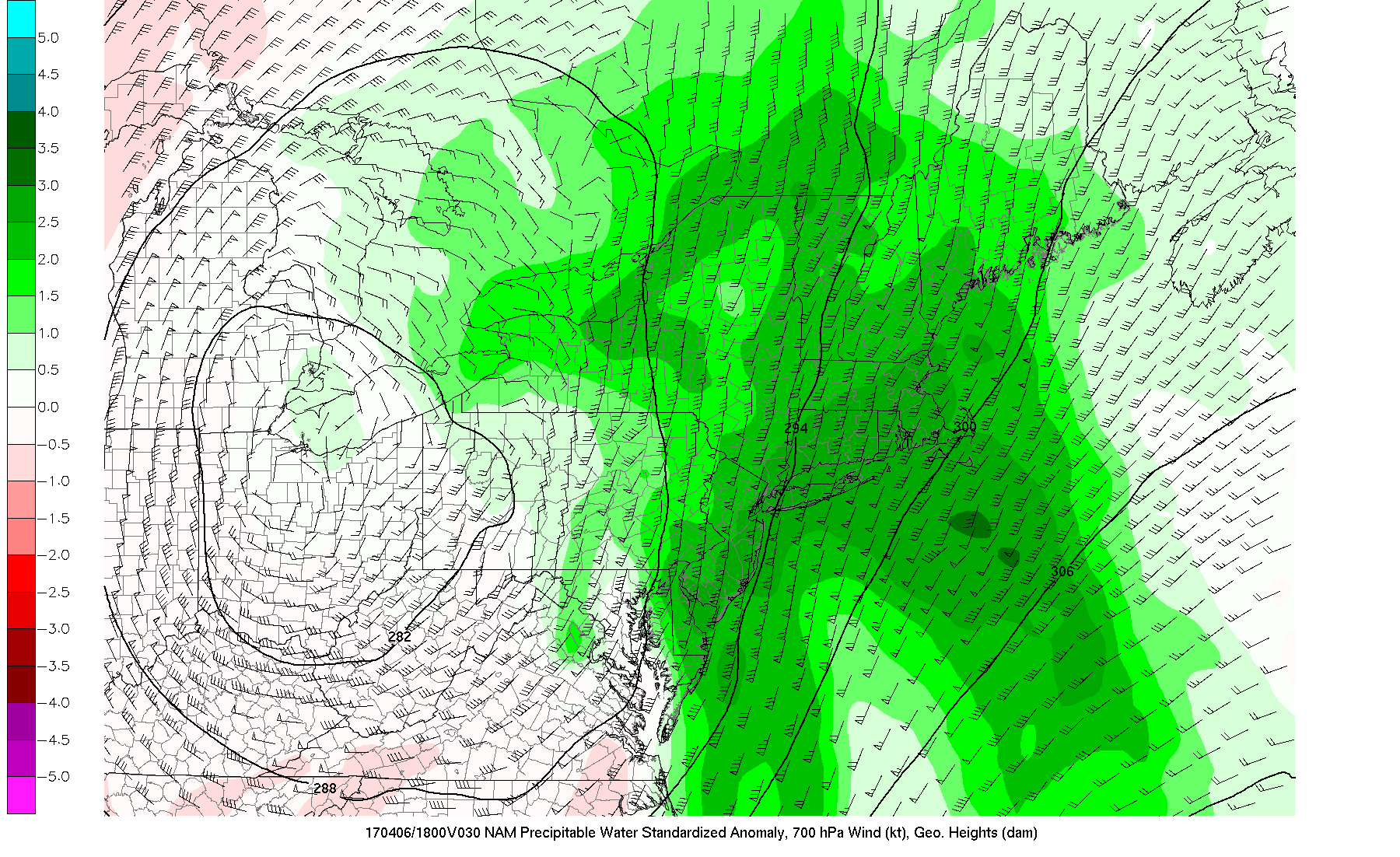 NAM model showing precipitable water values 2 and 3 standard deviations above normal