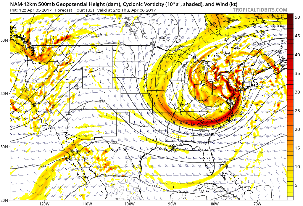 The NAM model showing large cut-off low over Ohio Valley on Thursday afternoon
