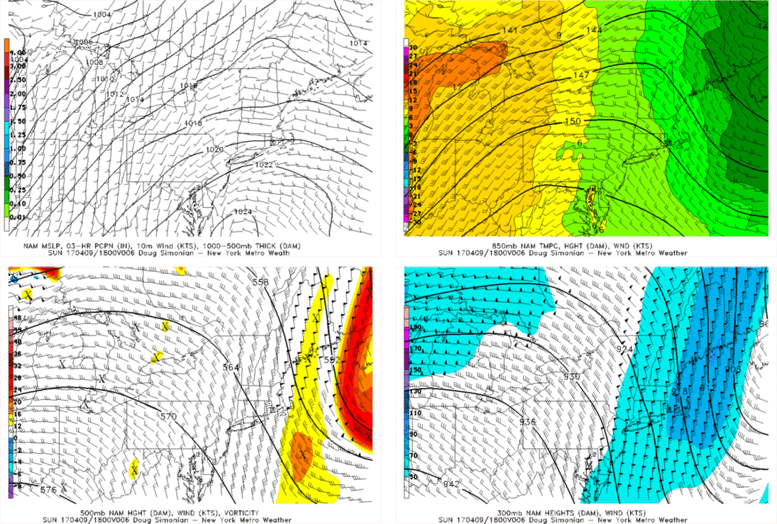 This animated gif illustrates these points well. This is a 4-panel plot of the NAM: top left is 1000-500mb thicknesses, precipitation, and surface wind barbs, the top right is 850mb heights, winds, and temperatures, the bottom left is 500mb height, winds, and vorticity, and the bottom right is 300mb heights and winds. The first image is valid for Sunday at 2pm, the next is valid for Monday at 2pm. Notice how for today at 2pm, there are still some remnants of the upper-level low in the picture, creating a kink in the heights, and thus more northerly flow aloft: look at how chilly the 850mb temperatures still are. But on Monday, the ULL will move out of the way, allowing for higher heights and much more southwest flow aloft — look how much warmer the 850mb temperatures are. Because of this, and still a good deal of ridging, we expect plenty of sunshine on Monday with temperatures well into the 70s — perhaps even 80 in the warm spots.
