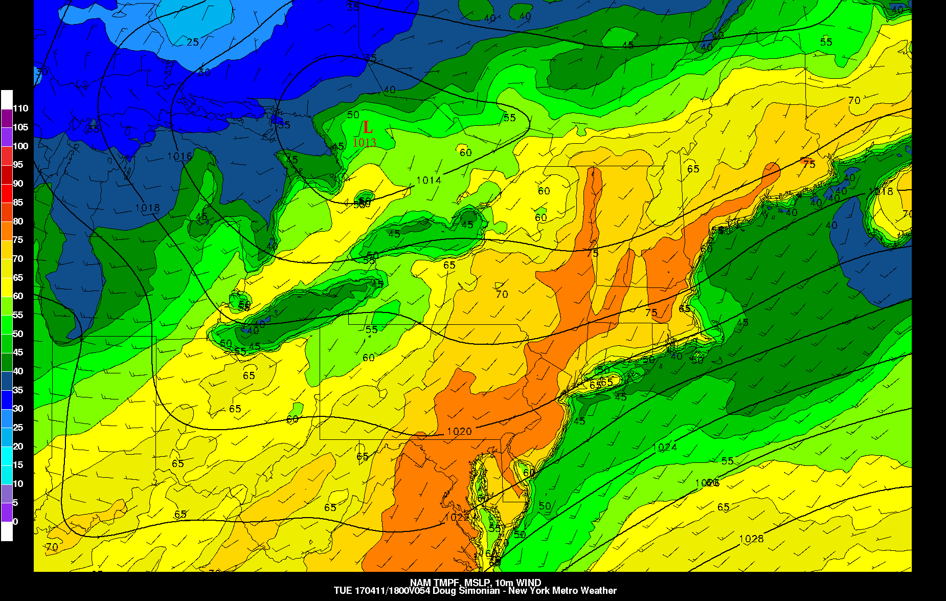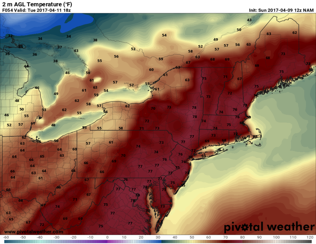 Today’s NAM valid for Tuesday afternoon shows temperatures well into the 70s. But notice the seabreeze causing much cooler temperatures right along the immediate coast.