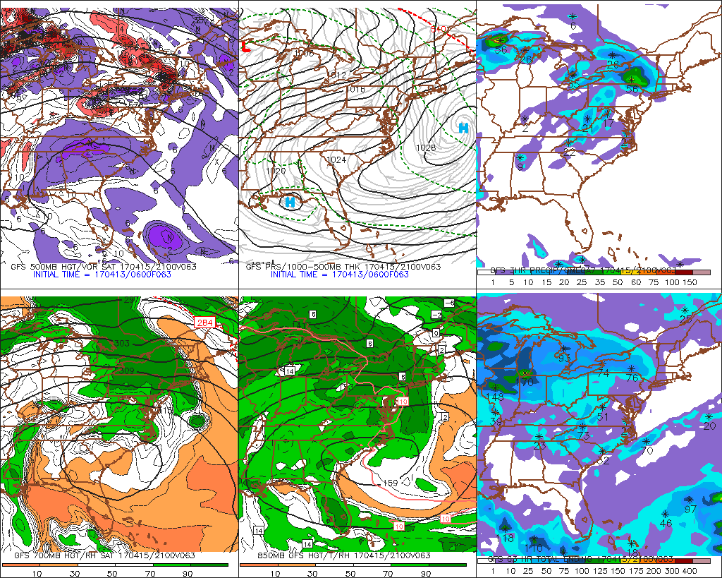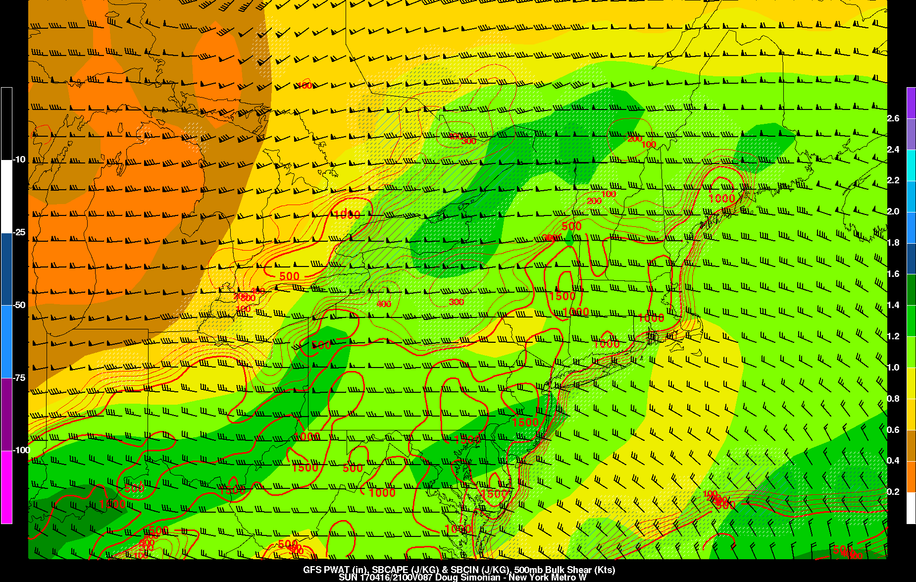 GFS model SBCAPE, 500mb bulk shear and precipitable water values support some scattered t-storms over region late Easter Sunday afternoon, if there is enough lift to break the cap