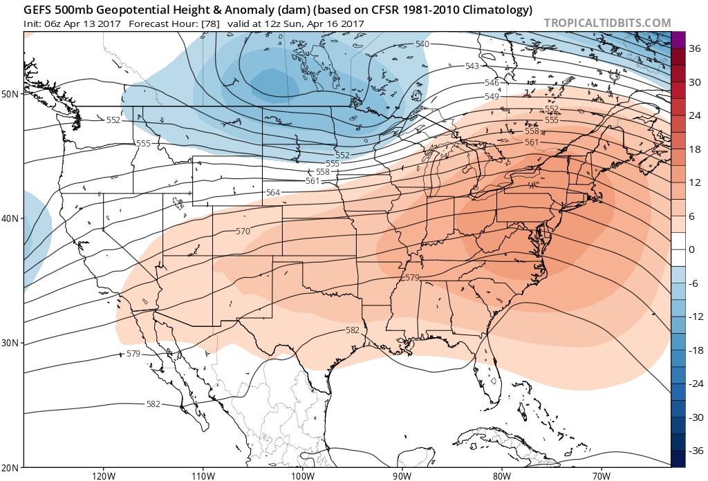 Then mid-level ridging builds into Northeast and Mid-Atlantic regions this weekend, out ahead large upper-level low/trough moving over Northern Plains and Great Lakes. This will allow for a much warmer airmass to move back into the region by Sunday. But this trough will cause the ridge to breakdown over the Northeast by Monday and Tuesday as the it moves into Southeast Canada. So this taste of summer warmth on Easter Sunday will be short-lived again.