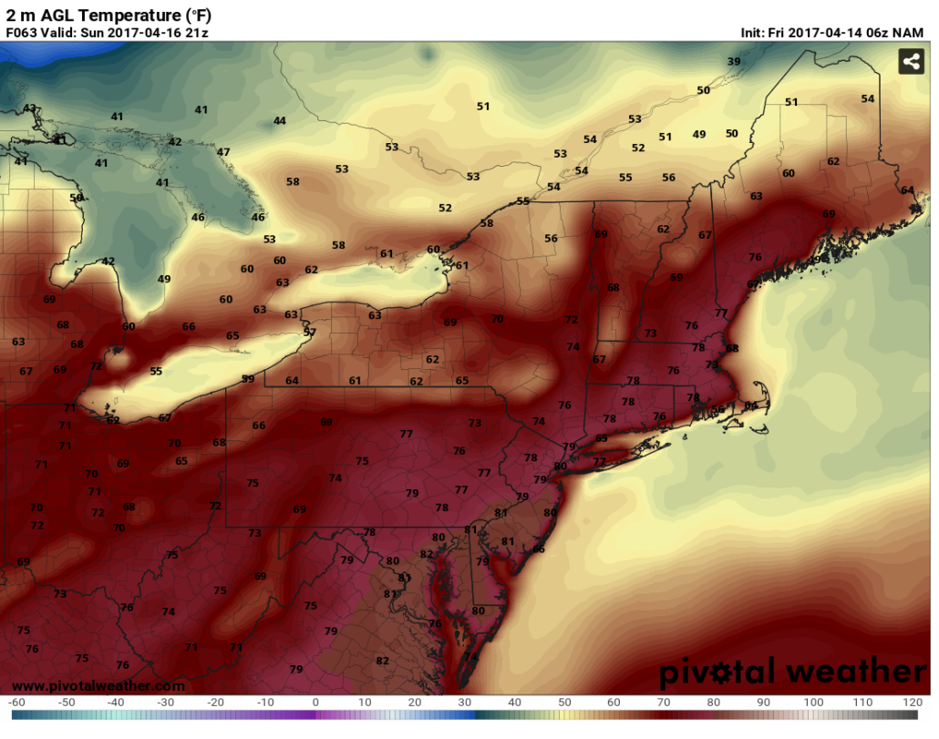 More sunshine and much warmer conditions are expected on Sunday. It will feel more like early summer again and without the humidity it will fantastic. Models continue to show 850mb temperatures 12°C to 14°C with west-southwest winds. This will support high temperatures in the lower to middle 80s over much of the region. Some afternoon sea-breezes will keep areas near the shore, just a little cooler with highs in the 70s.