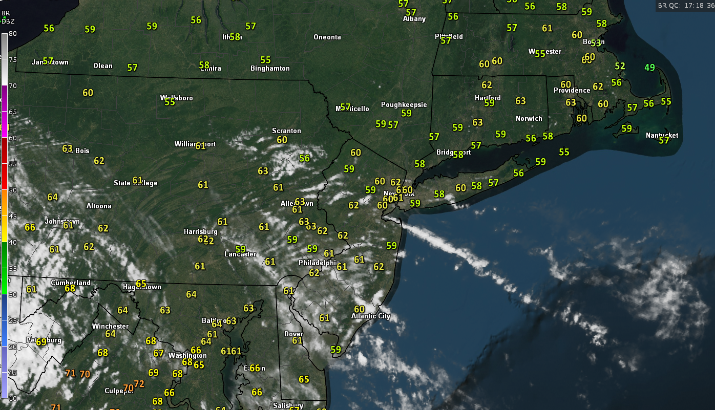 Some mid-high level clouds were noted on the latest visible satellite imagery this afternoon, streaming from the northwest, to southeast. This is mainly due to the cooler mid-level air from Canada interacting with the ever-so-slightly warmer air in the lower levels of the atmosphere that is situated over northeast Pennsylvania and portions of New Jersey. As the afternoon continues on, these clouds should begin to diminish and mostly sunny skies should continue until sunset across the area. There is a chance that some localized cloud cover may become established later today as a sea breeze begins to set up over coastal sections of New Jersey and Long Island. This may also in turn work to cool temperatures a little, possibly working them back into the mid 50’s.