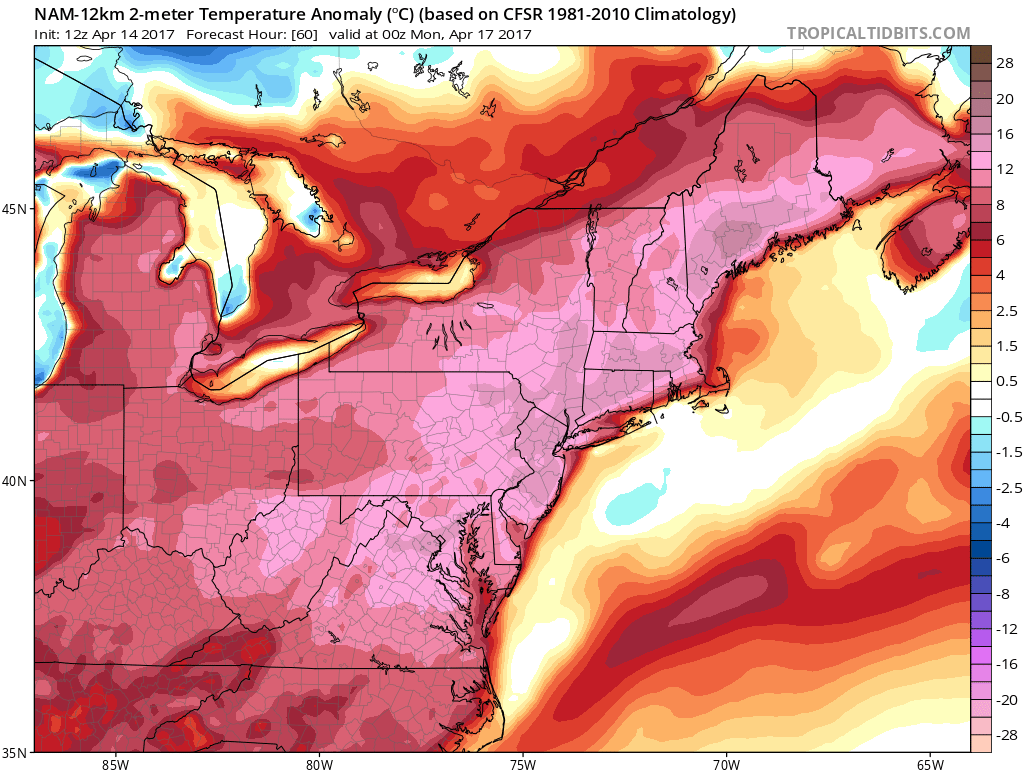 Sunday should be a much more “pleasant” day, as broken clouds in the morning hours give way to mostly sunny skies by early afternoon. With full sunshine, southerly winds, and warm low-mid levels of the atmosphere all present on Sunday, Easter is shaping up to be another much-above normal day with regards to high temperatures. As we progress throughout the afternoon, temperatures should easily climb into the upper 70’s across the entire area, with areas of low to mid 80’s possible over sections of southeast PA, NJ, southern NY, and Connecticut. Once again, these southerly winds may introduce a sea breeze feature for south-facing shores, so high may be limited to the 70’s for those locations. Regardless, temperatures should be anywhere from 20-32 degrees above normal during the day Sunday, so it will actually feel more like Summer than Spring!