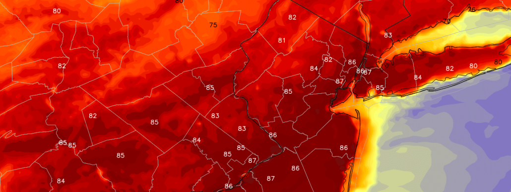 The west/southwesterly wind component to the airmass is probably the most critical (and meteorologically fascinating) aspect to the airmass which settles into the area. You may remember last week, much of the interior experienced warmth very similar to today. Temperatures rose into the lower and middle 80’s on those days as well. But near the coast, the cold ocean waters had their say — marine air shifted inland by 25 miles or so and kept coastal locations (and much of Long Island) very cool compared to their surroundings.