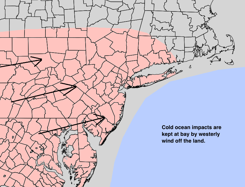 Nevertheless, even west-southwesterly wind like today acts to not only draw warm air into the region, but keep ocean effects at bay. The seabreeze and inland movement of cold, ocean air is mitigated overall as the west-southwesterly winds fight the easterly winds of the incoming marine air.