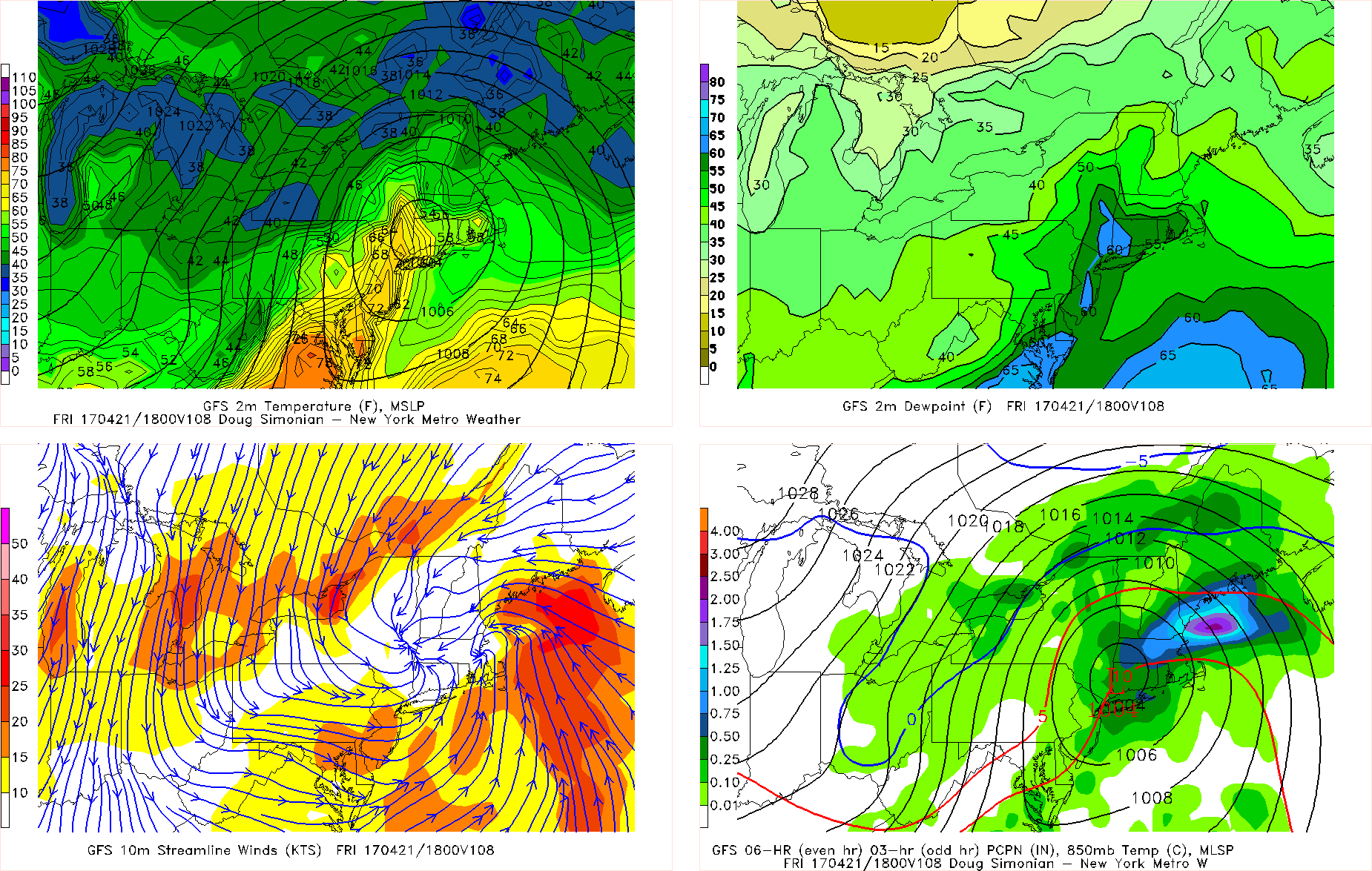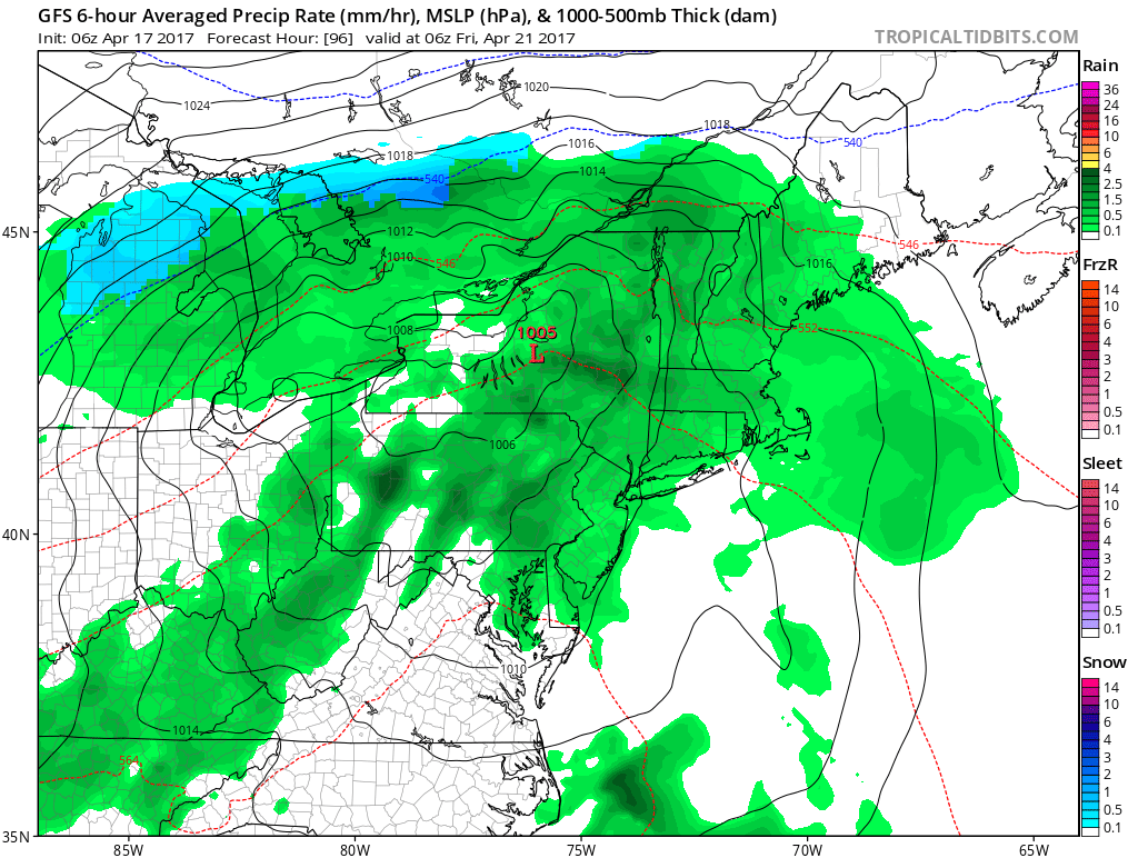 GFS model showing low pressure tracking just north of NYC with some rainfall and warmer temperatures by Friday afternoon