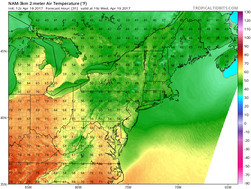 3km NAM model showing temperatures very cool marine airmass with 40s and 50s tomorrow afternoon over the region
