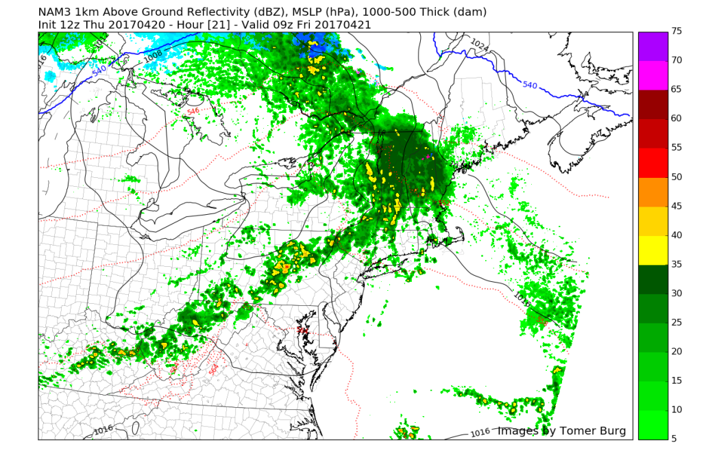 Low pressure tracking over the Great Lakes will cause another warm front to approach the region later tonight. Some scattered showers and isolated thunderstorms are possible, ahead of this front. Some heavy downpours and lightning are possible. But no significant flooding or hazards are anticipated. Temperatures will be the 40s or 50s much of the night, with mostly cloudy skies and marine airmass moving back into the region.
