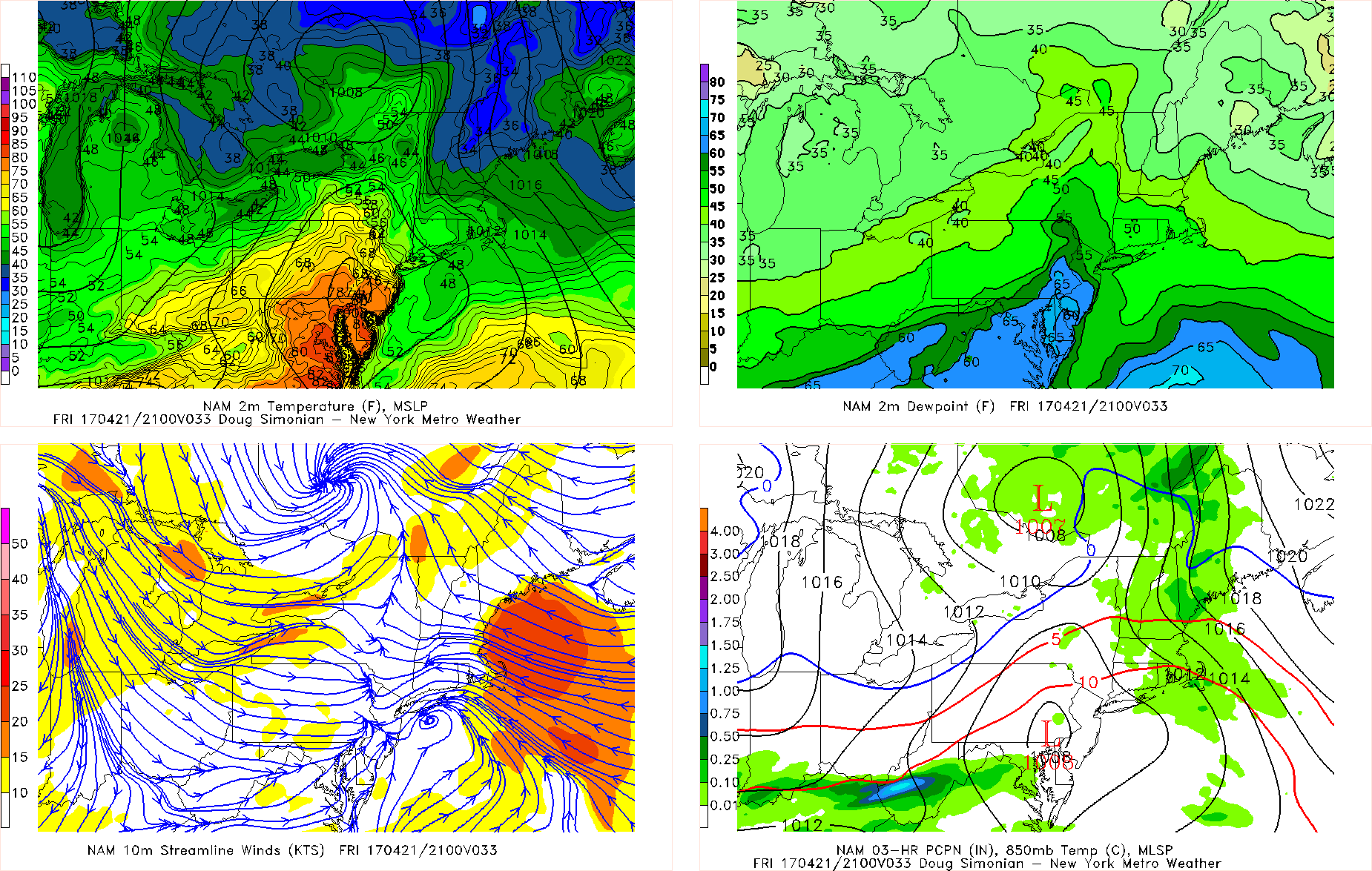 Tomorrow afternoon and evening, a weak-triple point low will develop along a warm front stalling over Southeast PA/Southern NJ. A cold front will also be approaching from the west. Some isolated or widely scattered showers and thunderstorm possible with more instability and convergence mainly southwest of NYC. Some heavy downpours, lightning and gusty winds are possible. But a lack of upper-level forcing and mid-level cap, will inhibit more organized convection.