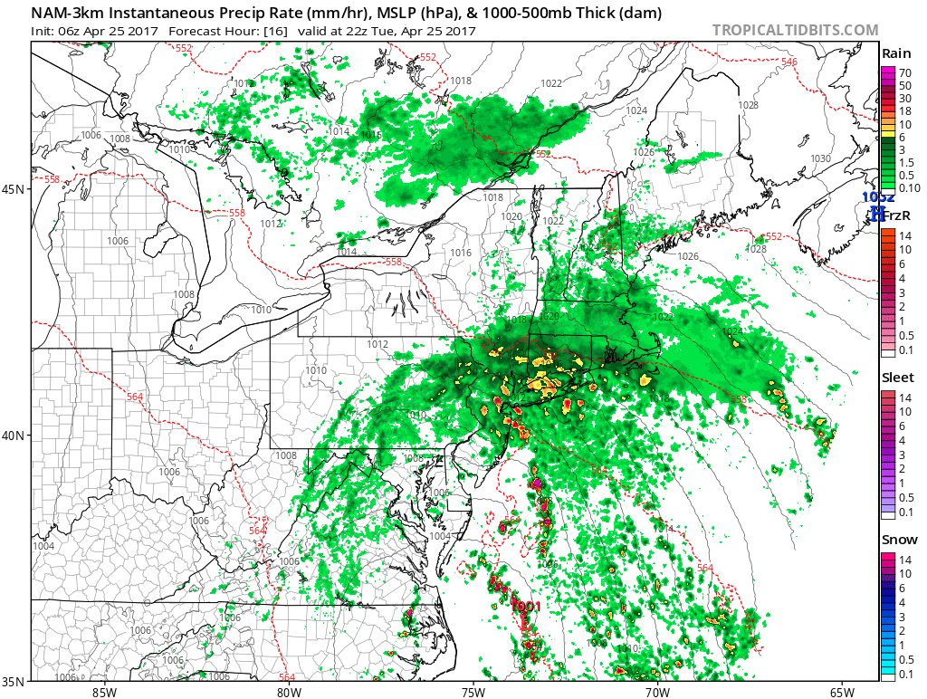 Mostly cloudy skies with some showers will continue to be around this morning. But rain will become steadier, and then heavy at times this afternoon and into early this evening, as an easterly 40-60kt low-level jet, associated with the cut-off low further south, moves through the local region. Instability still appears to be very low, but some rumbles of thunder can’t be complete ruled out. Then rain will begin taper off showers later this evening, as the low-level jet moves north the region. Temperatures will likely hold lower to middle 50s around the region, through today and tonight.