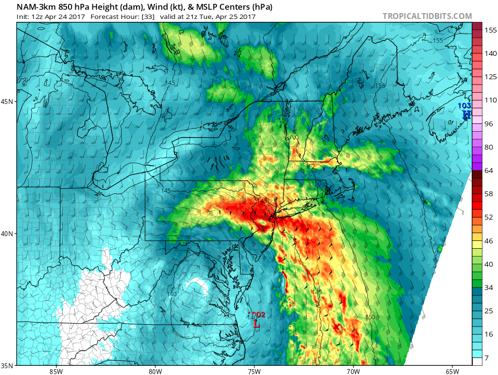 As the low-level jet passes overhead, easterly winds will be increasing between 15 to 25 mph with some gust 30-40 mph likely, over parts of region this afternoon and early this evening. Some isolated up to near 45 mph are possible right along the shore. But a stout inversion will keep be the strongest winds at 850mb-925mb (several thousand feet up), from reaching the surface. These onshore winds will also likely lead to some minor to locally moderate coastal flooding during high tides early this evening. Winds will diminish later this evening, as the low-level jet moves north of the region.