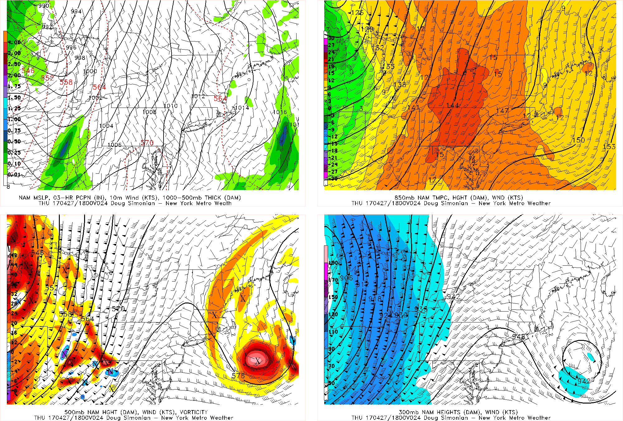 Even if the backdoor cold front remains to our north during the day on Saturday, it should eventually pass to our south on Saturday night and Sunday, cooling temperatures off a bit on Sunday with highs in the upper 60s with partly sunny skies. But a very strong disturbance that may even trigger a blizzard in the Northern Plains will be moving towards the area on Monday. Out ahead of this storm, we will be back into the warm sector and thus be able to warm into the upper 70s. This storm will be so deep that it will tap into the Gulf and send a very moist airmass into the region with precipitable water values over 1.5″. The strong temperature gradient with this storm will also lead to a very strong cold front that will push towards the area on Monday night. Also notice the very potent jet streak on the bottom-right panel — we are in the right-entrance region of that jet, which is favorable for upward vertical motion. Put all of these ingredients together and you get the potential for a forced line of convection that brings tropical downpours to the area on late Monday night into Tuesday.