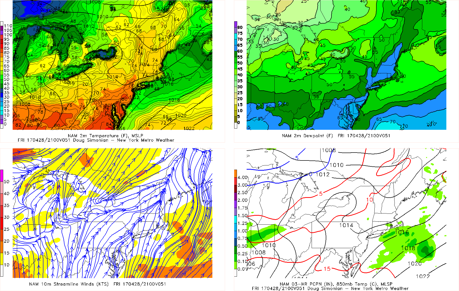 Notice how the low-level southeasterlies are gone and it is replaced by southewesterlies. Although 850mb temperatures are a tad cooler thanks to the front, they are still very warm and this cooling is easily more than made up by the deeper mixing and faster wind flow aloft, and thus temperatures can soar well into the 70s and perhaps low 80s in some spots. The dewpoints on the top right may be a bit overdone, but it does show that it may even feel borderline humid with this warm weather.