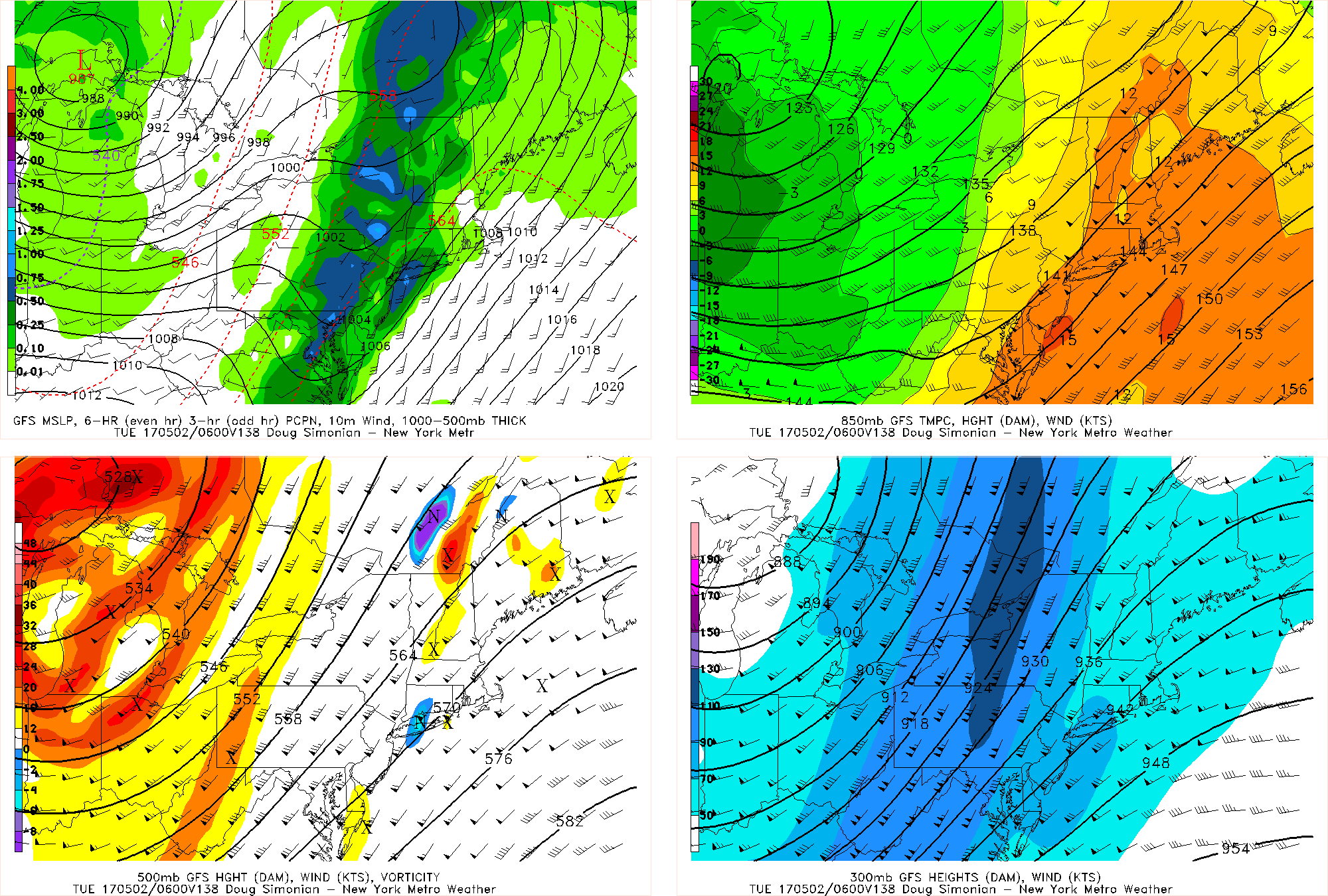 The cutoff low had brought a lot of east to west mid-level flow, too, which led to a relatively saturated column all-around. But with the big ridge out ahead of the storm in the Great Lakes trying to bring southerly flow aloft, but the remnants of the cutoff low still providing enough of a kink to the heights to flatten the ridge at our longitude, this will result in westerly flow aloft. This has a drier component, which should finally help bring sunshine to the area by Thursday afternoon. Combined with the very warm temperatures aloft (look at the 850mb temperatures on the top right panel), we could have easily hit the 70s and 80s. But there is still just enough lingering onshore flow at the immediate surface (check top left panel), as well as still weak wind flow aloft so that the marine layer will not completely be able to escape, and temperatures will thus be held back a bit from their potential since mixing will not be able to occur. Thus, we generally expect high temperatures in the upper 60s to low 70s, with cooler readings along the immediate shores.