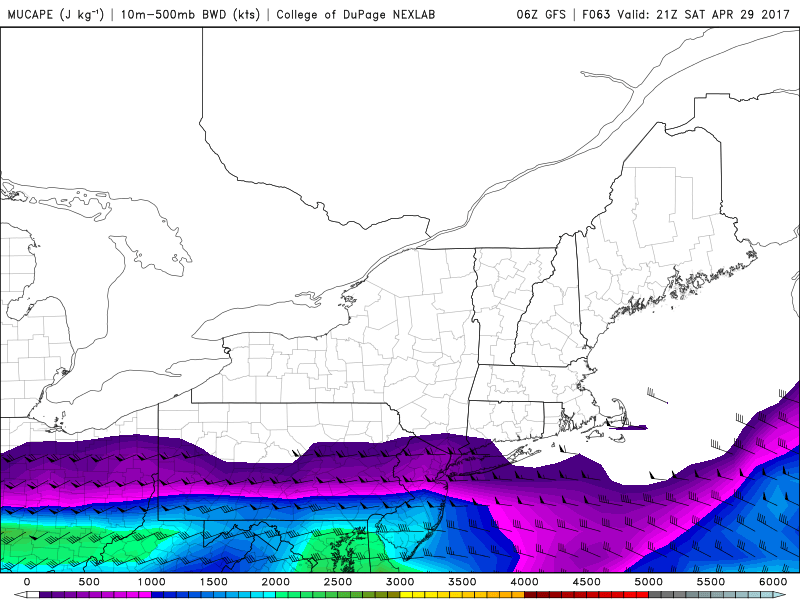 GFS model late Saturday afternoon showing the instability axis juxtaposed with 40-50kts of bulk shear, ahead of backdoor cold front over the Northern Mid-Atlantic region