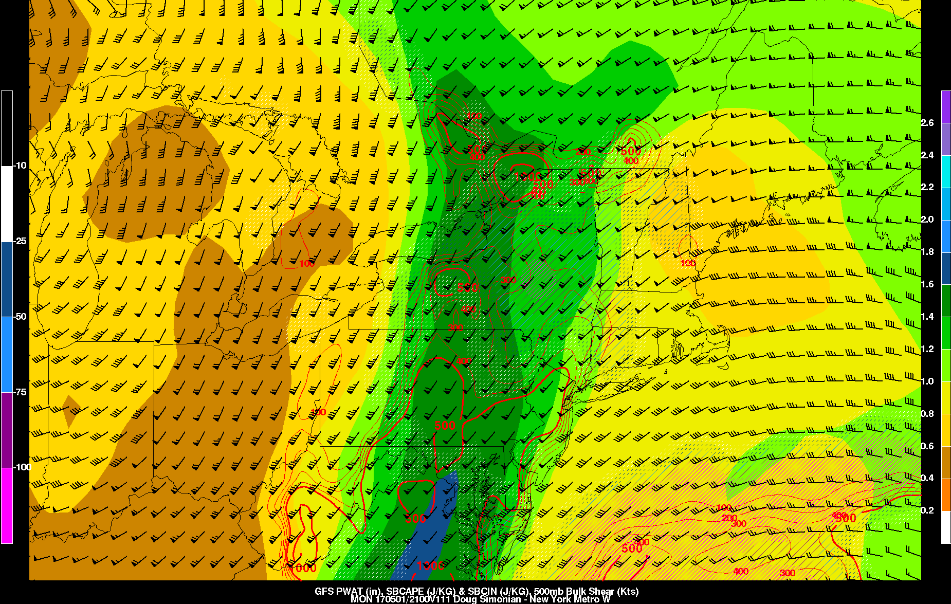 GFS model showing a plume of sub-tropical moisture with high precipitable water values, ahead of strong cold front with low SBCAPE (instability) and strong 500mb bulk shear by late Monday afternoon over Northeast and Mid-Atlantic regions
