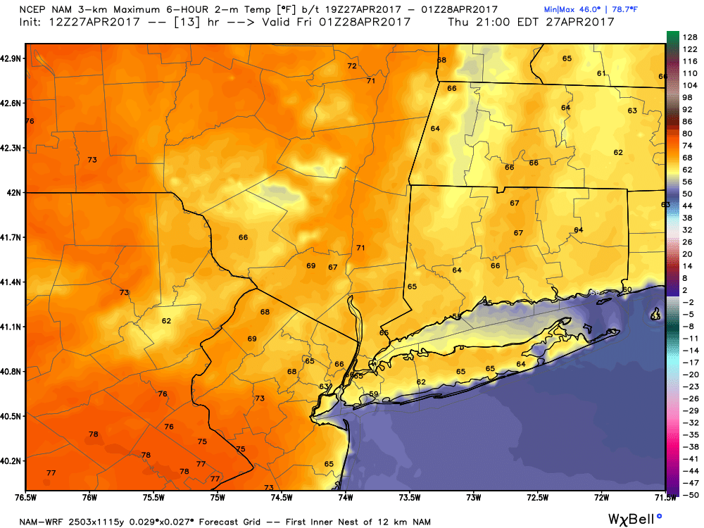 Overall with little more sunshine this afternoon, temperatures should rise in the upper 60s to lower 70s over Northeast NJ, NYC and nearby areas. Some parts of Western NJ and Southeast PA, may see temperatures rising into mid-upper 70s this afternoon with a little more clearing likely later this afternoon. But some areas along the coast and further northeast, including Long Island and Connecticut may see more clouds and southeast winds keep temperatures from rising out of the low to mid 60s.