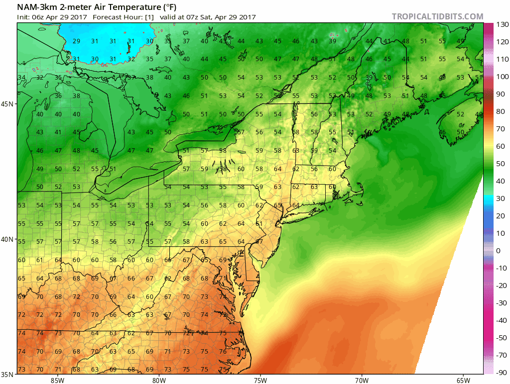 For those who love Spring and Summer temperatures, the forecast takes an unfortunate turn late tonight into Sunday as a back door cold front approaches. A frequent menace so far this Spring season, these fronts originate from the cooler, maritime air in New England. This one will be no different — as the front moves through tonight into Sunday, temperatures will fall several degrees from where they were today.