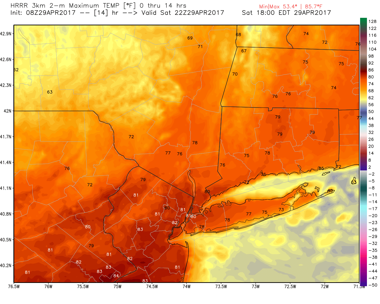 Regardless, the thunderstorms have moved off to the east this morning and will continue to shift seaward with the associated mid level disturbance. The frontal boundary associated with the storms has sunk southward over Central New Jersey this morning, which changes the forecast in a few ways. Most notably, the very warm temperatures which were once projected in parts of Northeast NJ, NYC and Southeast NY are unlikely to occur, as the very warm air is shunted further south. Temperatures will still rise into the lower 80’s, but the upper 80’s will be confined to the mid atlantic.