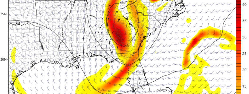 As the storm continues into tomorrow evening, the low level jet should be directly overhead and this should bring the heaviest impact for our area. Heavy rains should be streaming in from the south/southeast during the evening hours, with locally heavy downpours possible. Some gusty winds of around 35-45 mph will be possible in some of the heaviest downpours, as stronger winds just above the surface are able to mix down.