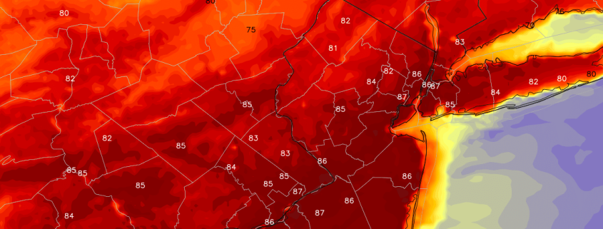 The west/southwesterly wind component to the airmass is probably the most critical (and meteorologically fascinating) aspect to the airmass which settles into the area. You may remember last week, much of the interior experienced warmth very similar to today. Temperatures rose into the lower and middle 80’s on those days as well. But near the coast, the cold ocean waters had their say — marine air shifted inland by 25 miles or so and kept coastal locations (and much of Long Island) very cool compared to their surroundings.