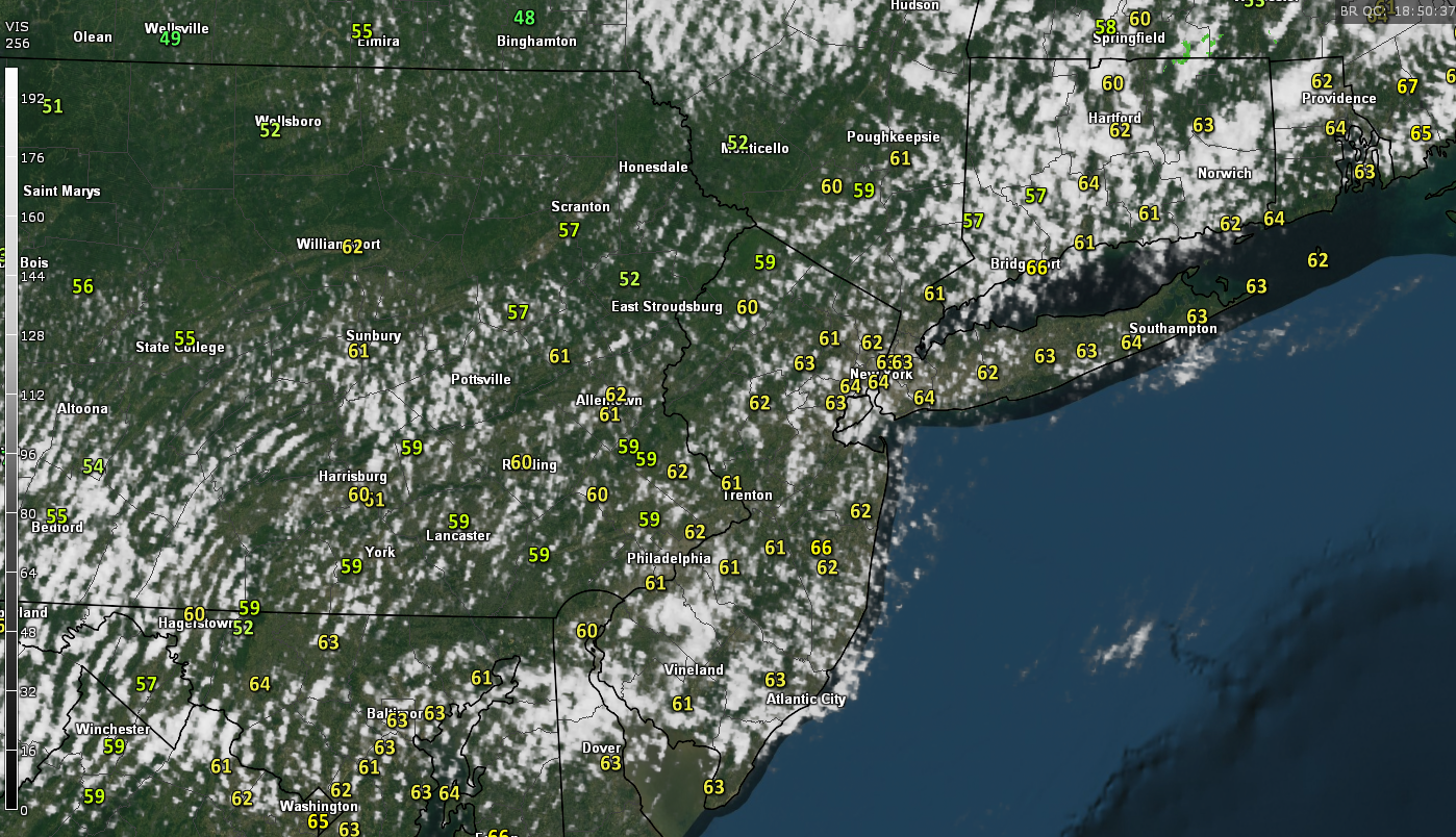 As mentioned, we had a cold front push through the area early this morning which brought in yet another cold shot from deep into Canada, in addition to clearer and drier conditions. As of 2pm this afternoon, temperatures around the area were steady in the upper 50’s to lower 60’s across the entire area. As weak residual energy associated with the old cold front exits the region, spotty clouds and maybe a very light shower may be possible (especially over portions of Connecticut). However, as this residual energy continues on quickly to the east, high pressure from the west currently over Great Lakes region will move towards our area this evening and into tomorrow morning. As this high moves east, clouds should gradually dissipate and be replaced by mostly clear conditions as we head into the late afternoon and evening hours.
