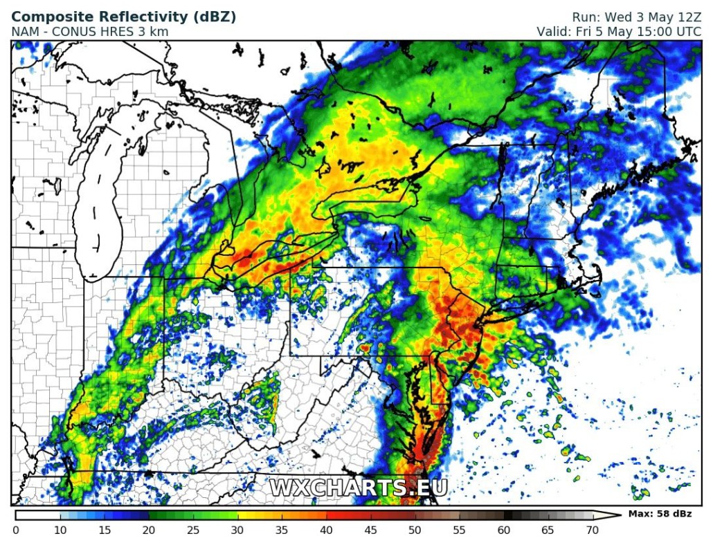 With a great number of details being highlighted this far out, there are some uncertainties regarding this system that will ultimately determine how much rain the region sees. For example, if we see the low level jet become more delayed in future model runs, then the potential for the heaviest rainfall will shift east to portions of southern New England. Additionally, the models have been trending more towards a quick hit of around 6 hours for the heaviest rainfall during the day on Friday. There is the potential that the models are sniffing out the potential for more convection to develop and affect the region, which may produce very heavy rains for some locations, but not nearly as much around that convection, or storms. At this time, we do feel that there is a reasonable amount of confidence in around 1-2″ of rainfall during the day on Friday, with some gusty winds of around 25-35 mph in the heaviest downpours. Local amounts of up to 3″ may be possible in areas that see training of the heaviest rain. Stay tuned for further updates on this storm over the next 48 hours, and make sure to check in with your local NWS for information on any watches or warnings that may be posted!