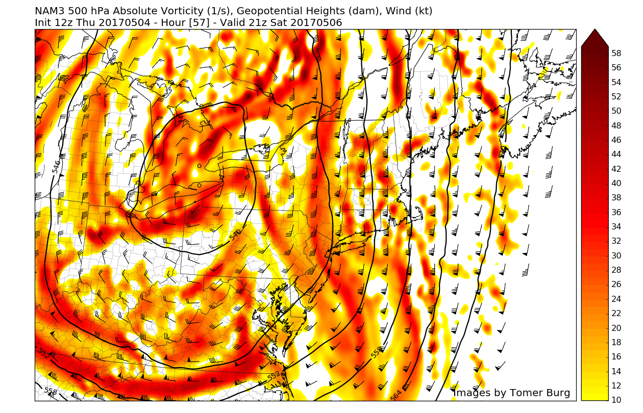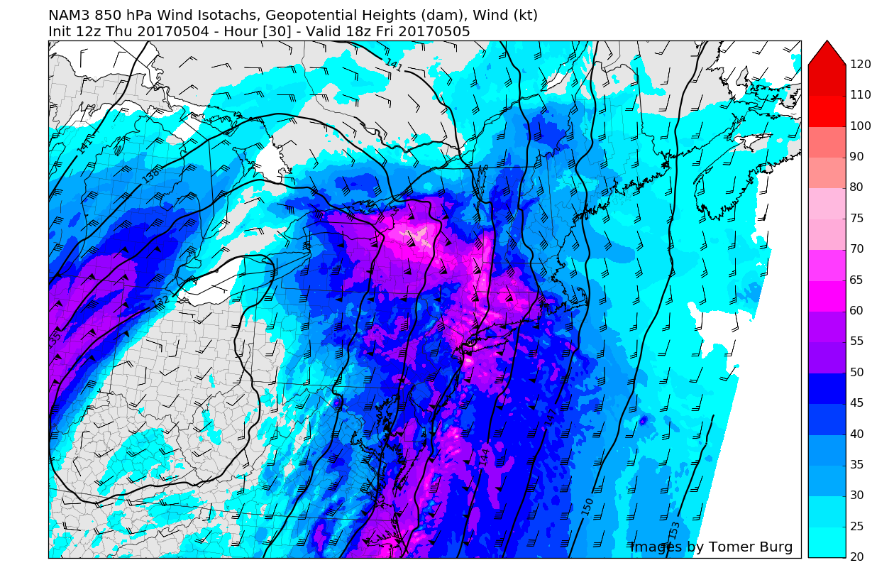 NAM model with 850mb low-level jet moving through region later tomorrow morning