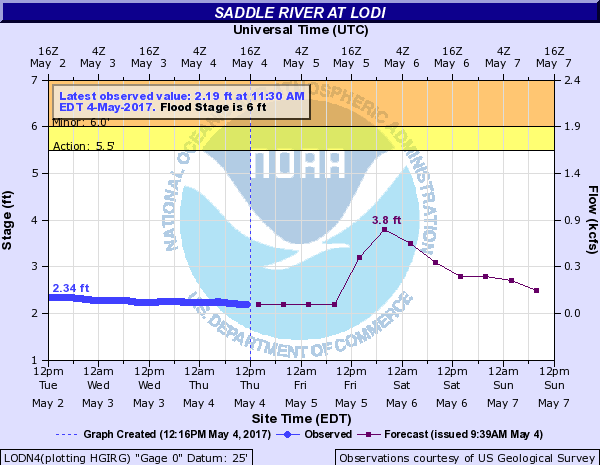 Saddle River at Lodi, NJ forecast rise but remain below flood stage.