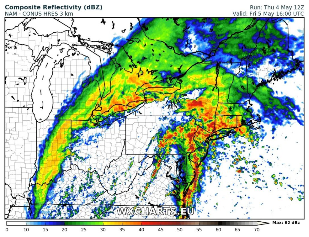 Then tomorrow morning, more steady rain will become heavy at times later in morning and into the mid-afternoon hours, as south-southeasterly low-level jet moves northward through region. This will be firehose of subtropical moisture with bands of heavier rain coming off the Atlantic. But it will somewhat  progressive over the region. So rainfall totals are expected to range between 1” to 2” are expected over much of the region.