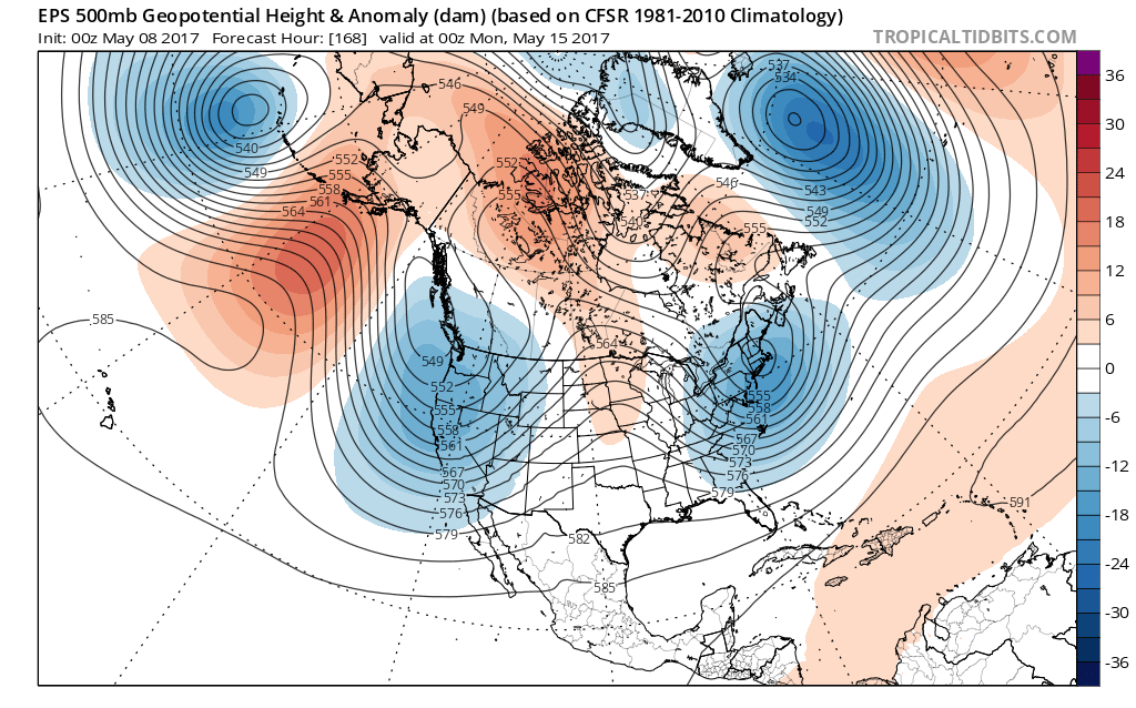 High-latitude -NAO blocking retrograding from over Davis Strait will only allow the upper-level low to slowly lift of the Northeast this week. So temperatures are likely to remain below normal into at least Tuesday and Wednesday. Each day will start with some sunshine then more clouds arrive during the afternoon. Some isolated showers can’t be ruled out. But these showers will be shifting further north and east with after each day, as deeper, drier northwest flow develops over the region. High temperatures will be generally range upper 50s to lower 60s. Overnight lows will be in 30s over Interior and 40s near the coast.