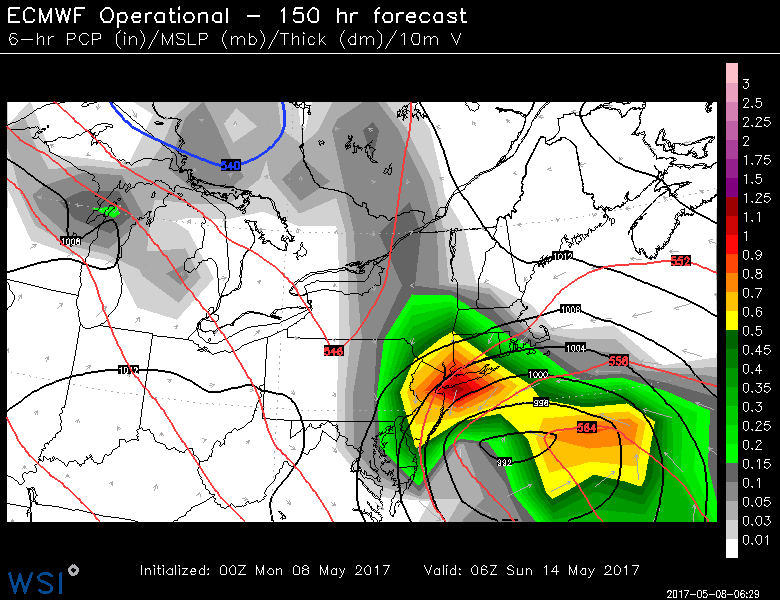 Latest ECMWF model forecast with some heavy rainfall over the local region from a coastal storm Saturday night