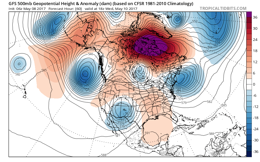 GFS model forecast with anomalous blocking extending from Hudson Bay to Davis Strait with upper-level still near New England on Wednesday afternoon