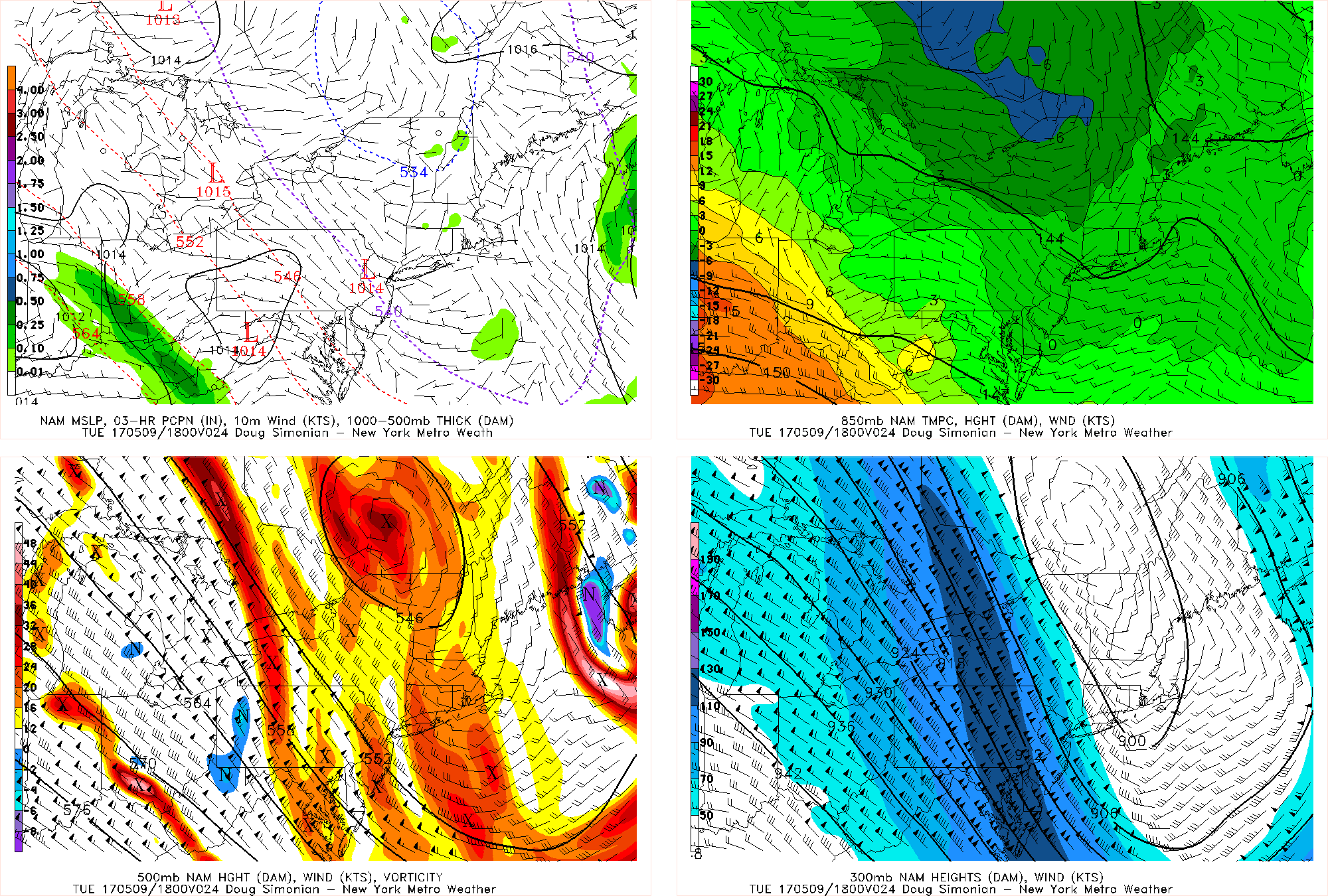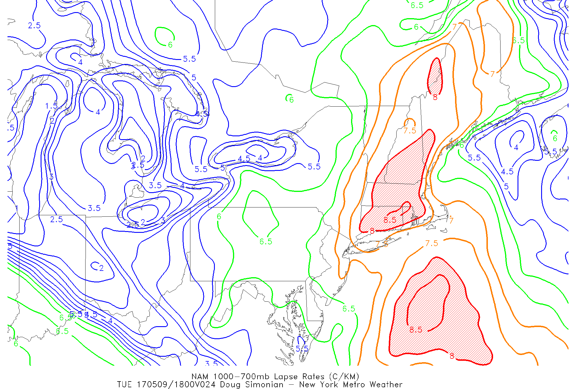 As we head into tomorrow afternoon, it is more of the same story. The upper-level low will continue to sit near the area, allowing for instability to remain present as well as areas of vorticity rotating cyclonically into the area. This will lead to afternoon cumulus clouds, which combined with the chilly airmass will mean temperatures will hold to similar levels to today. Fortunately, there should still be enough downsloping NW flow for breaks of sunshine. Notice how 850mb temperatures are solidly below 0C across the region, but also notice how the wind barbs at that level are very light. This means that even with deep afternoon mixing, winds will remain very light tomorrow. The light wind flow means that sea-breezes can thus form along the coast, making it even chillier there than inland areas. With the core of the instability remaining to our northeast, any afternoon instability showers will generally remain in CT.