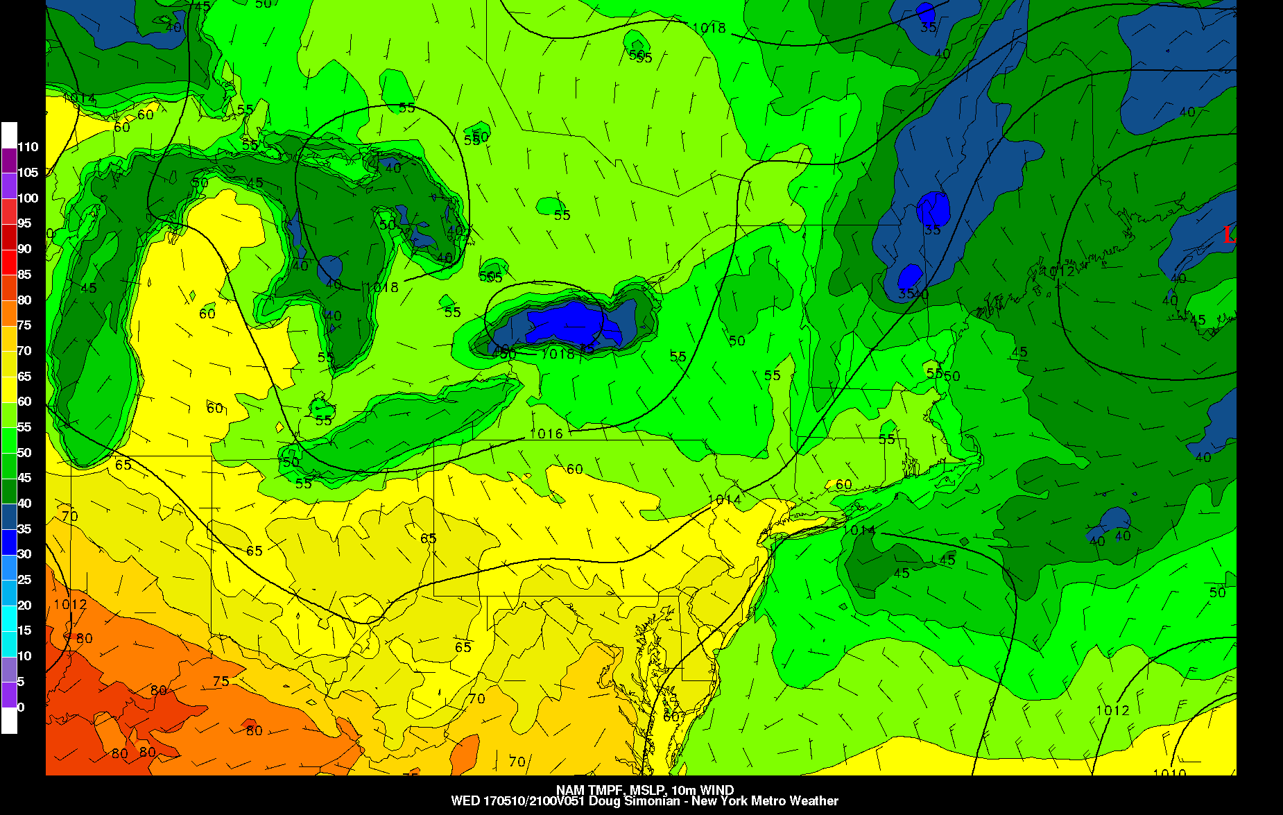 Today's NAM model valid for Wednesday afternoon shows light winds with temperatures rising into the mid 60s.
