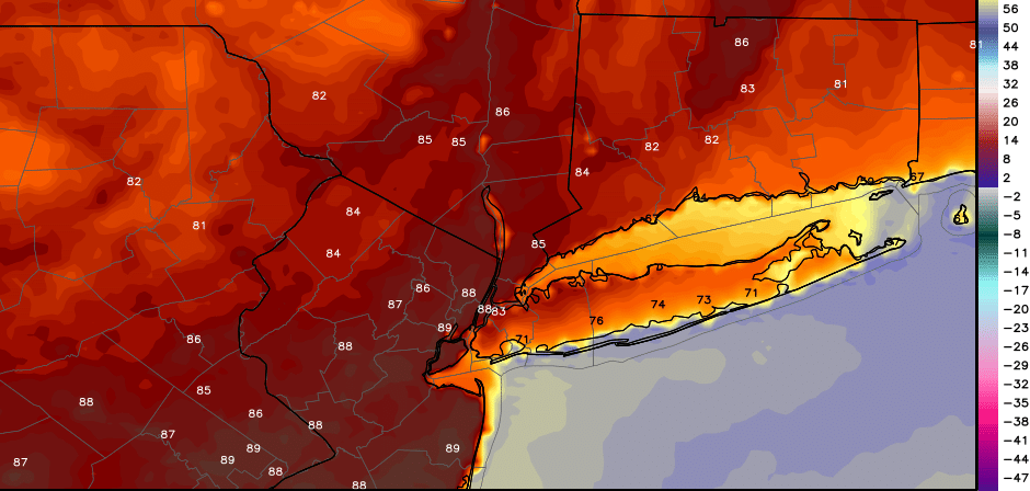Stronger ridging builds over the region Wednesday and Thursday with more southwest winds and 850mb temperatures 16°C and higher. This will support very warm, summery airmass over the region again. Highs will be at least in the mid-upper 80s, away from the coast. But some spots over New Jersey, NYC could see temperatures around 90 degrees, each day. Humidity will be a little higher. But not too uncomfortable. Sea-breezes may keep areas right along the shores, from rising out of the 70s or lower 80s, each day.