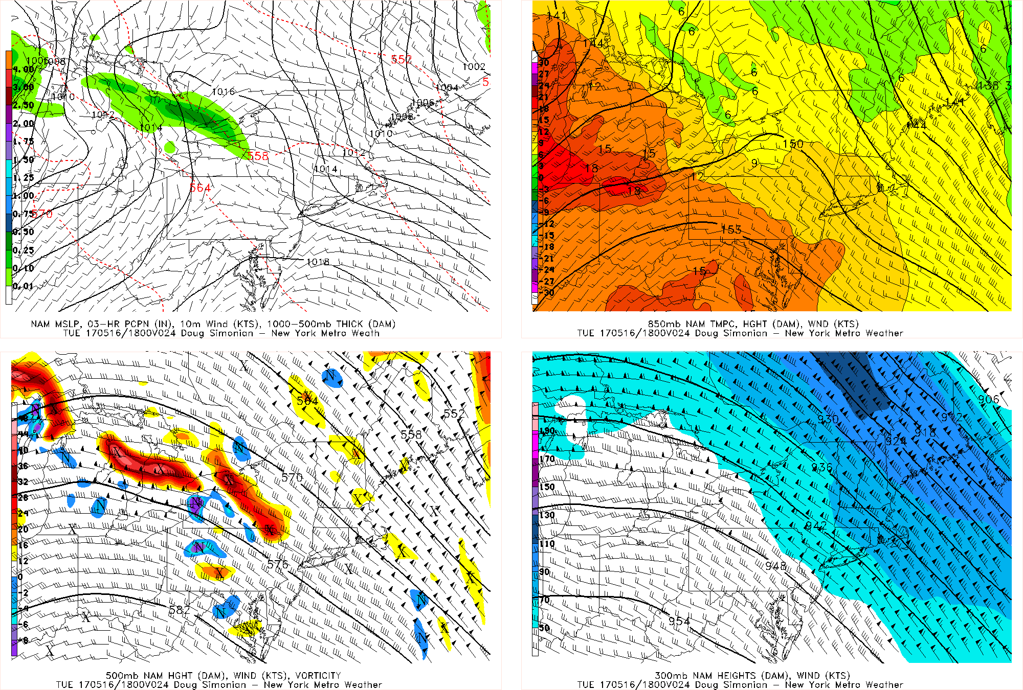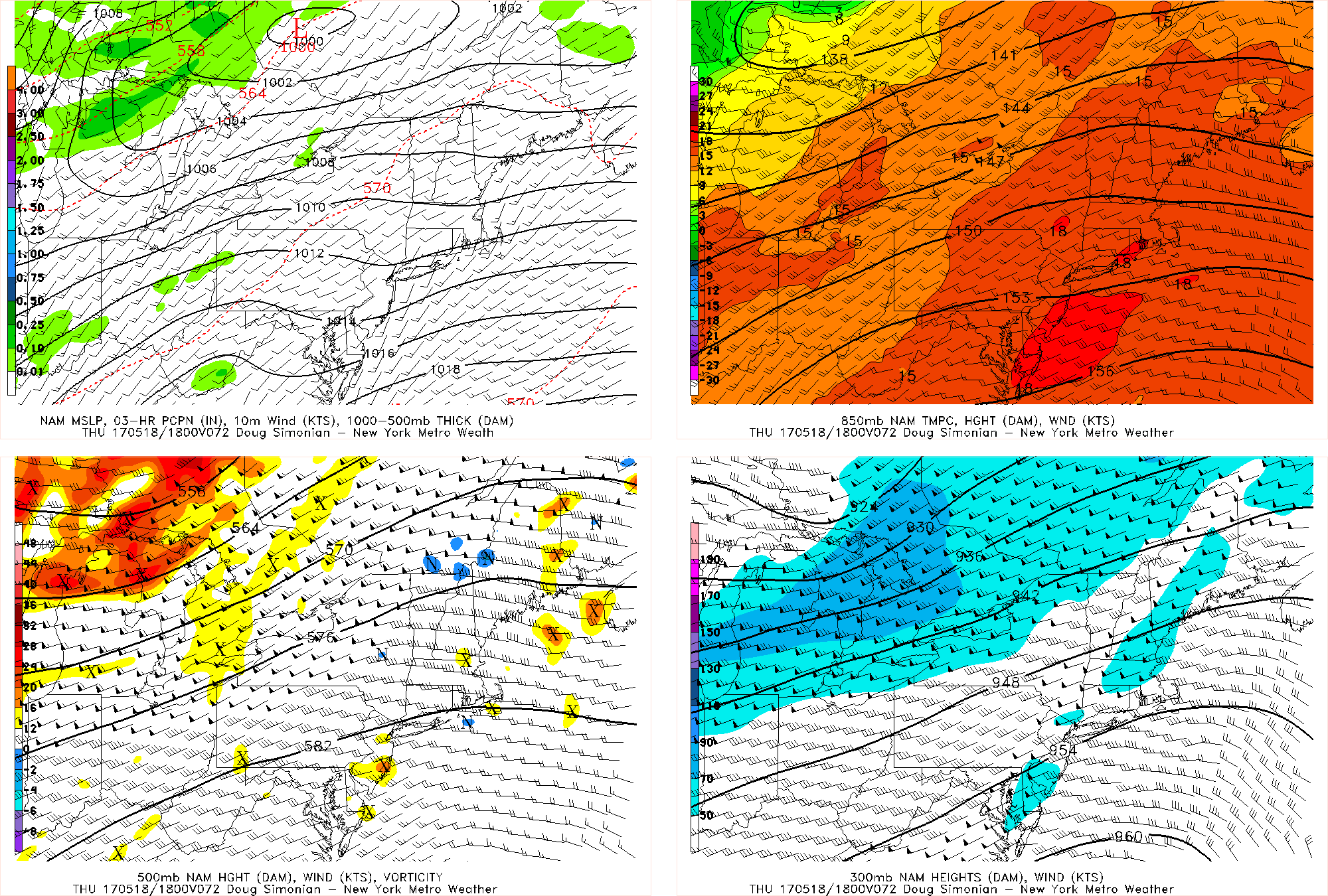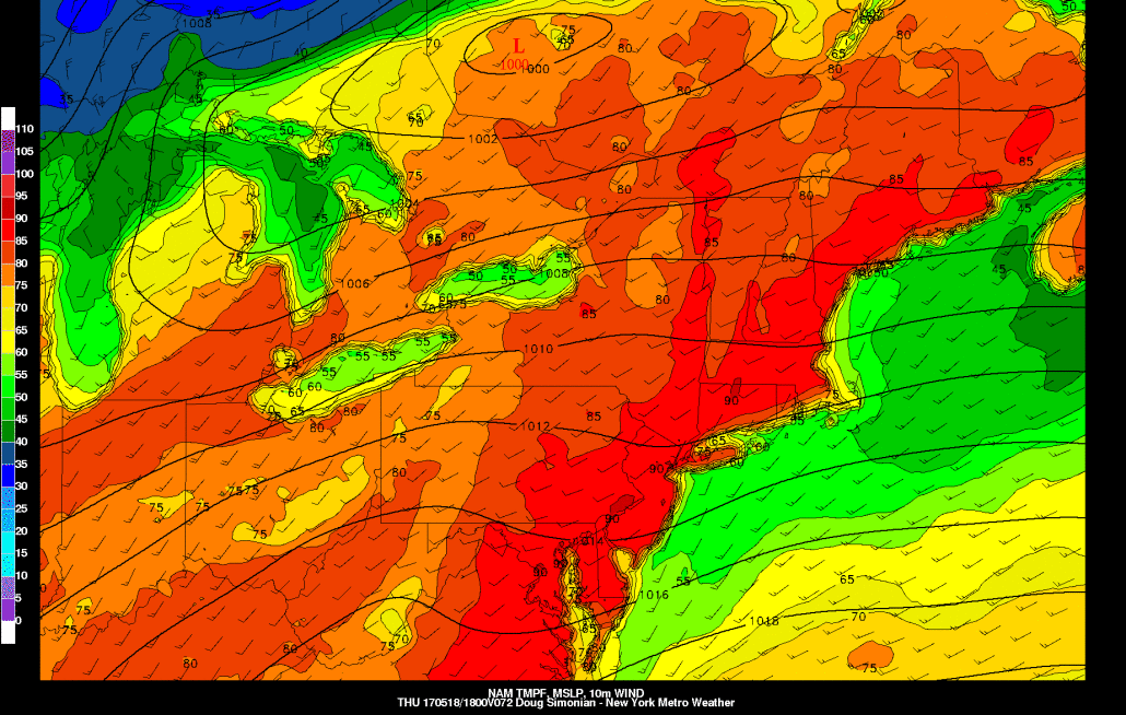 Take a look at how this progression evolved over the next few days and how the heat has to maximize for Thursday. Notice in the above image how as that disturbance moves into the Great Lakes, the flow out ahead of it becomes uniformly southwest and also much faster as the height gradient between the disturbance and the ridge tightens, which will further allow more heat and humidity to advect into the area. Thus, 850mb temperatures really spike to around 18C, which may support widespread highs in the low 90s for most of the region! Humidity will also be somewhat high, but not necessarily unbearable — but still quite a summery day is in-store. Again, though, this southwest flow places areas east of NYC in an onshore component, so temperatures may hold around 80 degrees in those locations. A few high clouds may stream in ahead of the disturbance, but otherwise mostly sunny skies are anticipated.