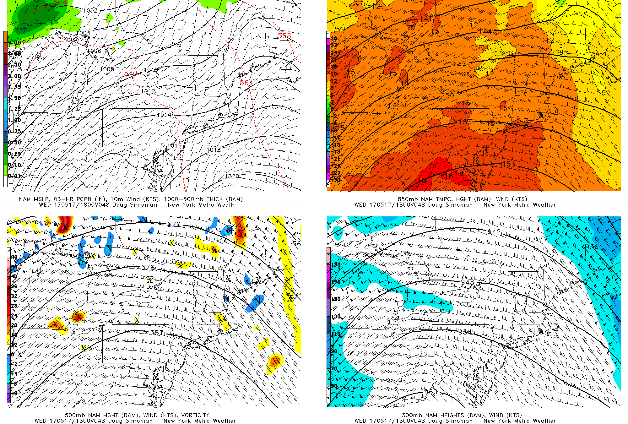 But notice that the flow aloft is still northwest at 850mb, 500mb, and 300mb, as the departing upper-level low associated with the storm system on Saturday still has not completely cleared Northern New England. This will prevent a true scorcher and also lead to humidity being very low, but 850mb temperatures between 10-12C plus downsloping flow should lead to temperatures approaching 80 degrees for the most part. This flow may be able to stop seabreezes as well, so the coast should also see highs in the upper 70s to around 80. The only exception will be Eastern Long Island — particularly the North Fork — as this flow will usher in some air from the Sound and keep temperatures a few degrees cooler. The ridging building in should assure mostly sunny skies, though that vorticity ripple to the northwest may mean an increase in high clouds for northern NYC suburbs.