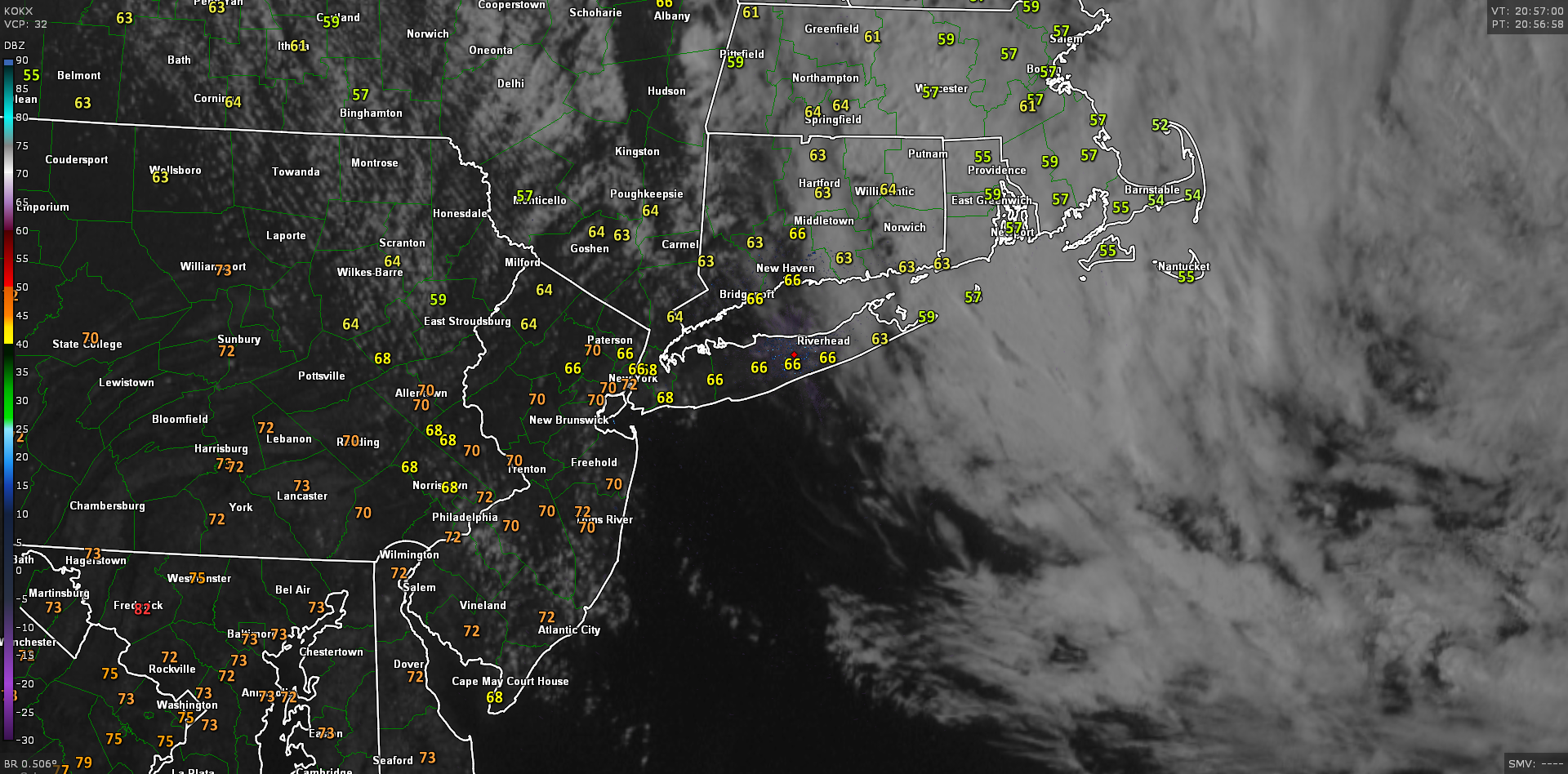 Current regional radar mosaic, surface temperatures, and visible satellite imagery showing much-improved conditions across much of the area